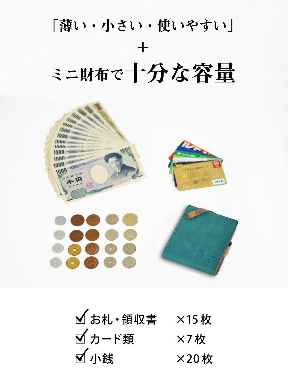 【理 kotowari® mini】は「薄い・小さい・使いやすい」を徹底的に追求した革のミニ財布です。その容量だってミニ財布では十分すぎるほどです(※1)。