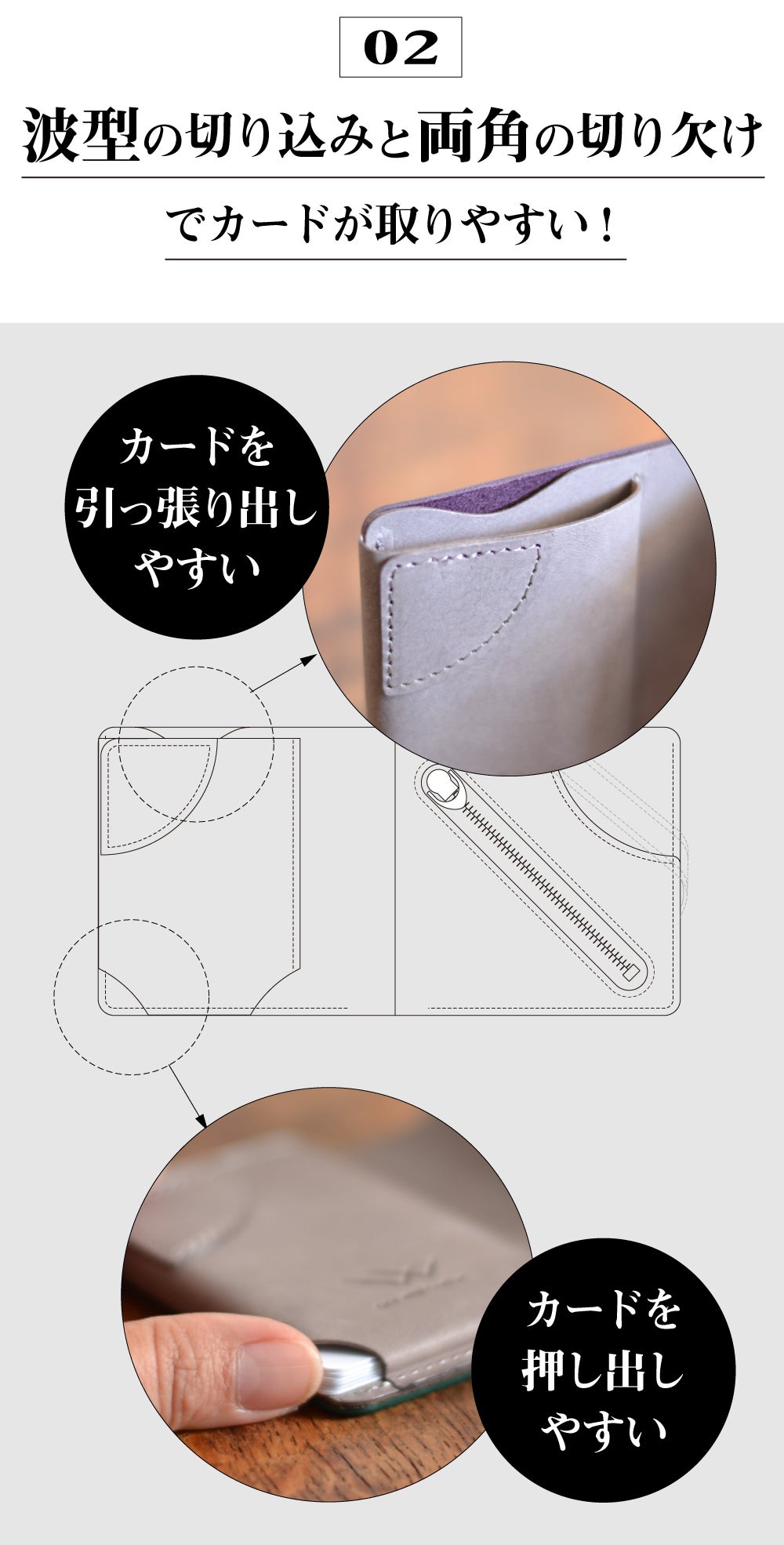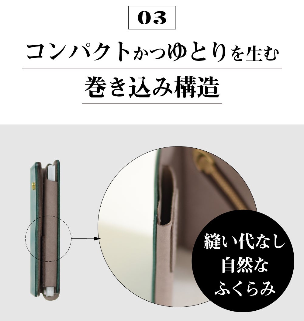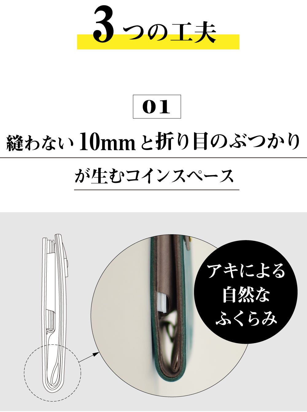 縫い代がない分、財布全体のサイズを縮小でき、かつカードケースの自然なふくらみによりカードの収納がより楽になります。