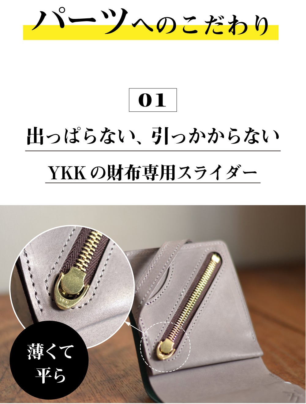 ファスナーはYKK社の「EXELLA(エクセラ)」を採用。ファスナー部分の品質の良さはもちろんのこと、財布用につくられた薄くて平たいスライダー(持ち手)を使うことで、財布の厚みを最小限にし、つまみやすくなりました。