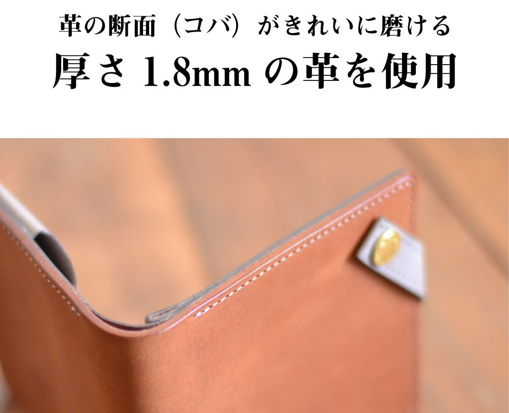 実用時の財布本体の厚みはたった15mm程度ながら外革には約1.8mm、内革には1.0mmのヌメ革を使用して、薄いミニ財布特有のペラペラ感を無くし、しっかりとした牛ヌメ革の高級感を醸し出しています。