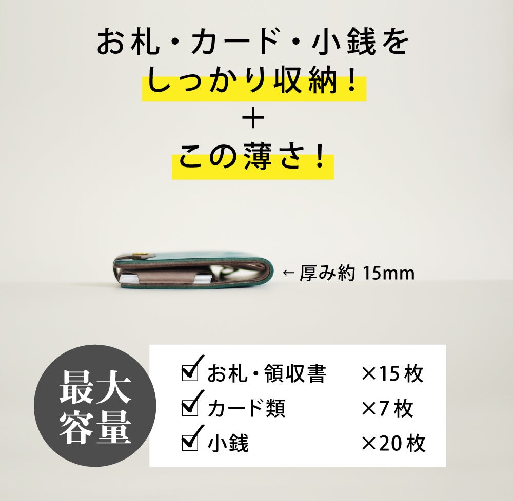 ・ミニ財布ですので、あまり多くの紙幣・コイン・カードを入れると、財布の型崩れの原因となります。内容量が推奨値※を超えないようご使用いただくと長くキレイにお使いいただけます。
