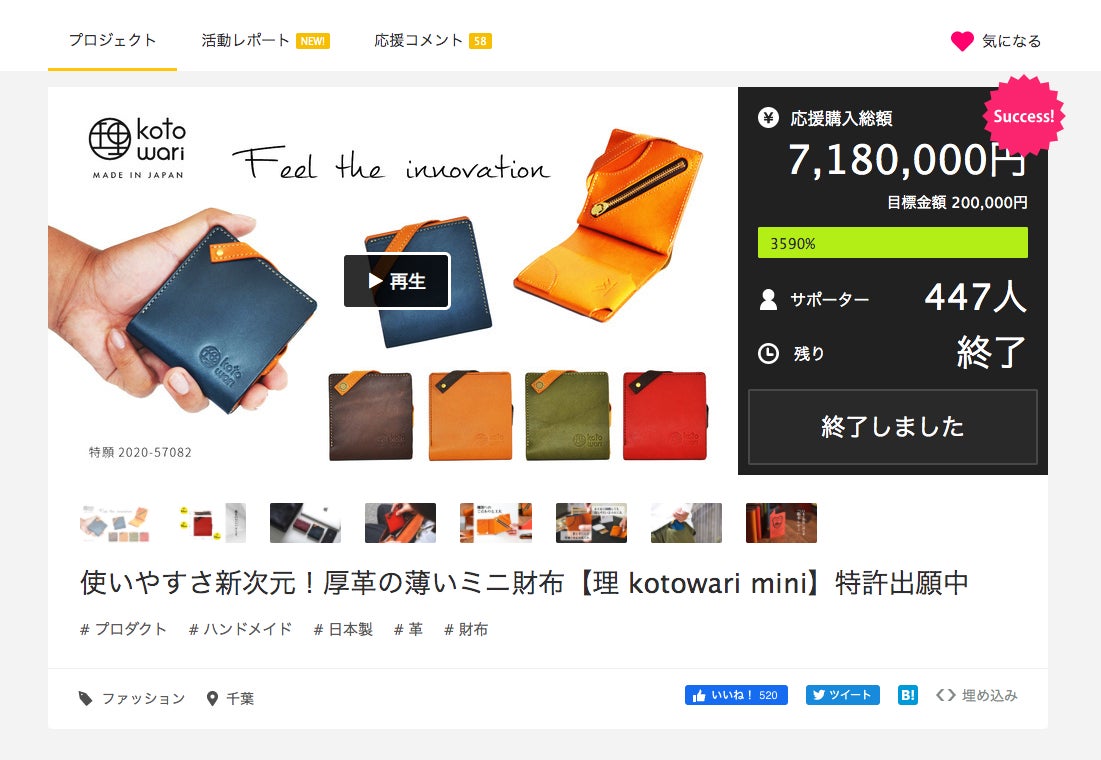 また、第2弾となる【理 kotowari® mini】(栃木レザーバージョン)のクラウドファンディングでは総額718万円という多くのご支援をいただきました。