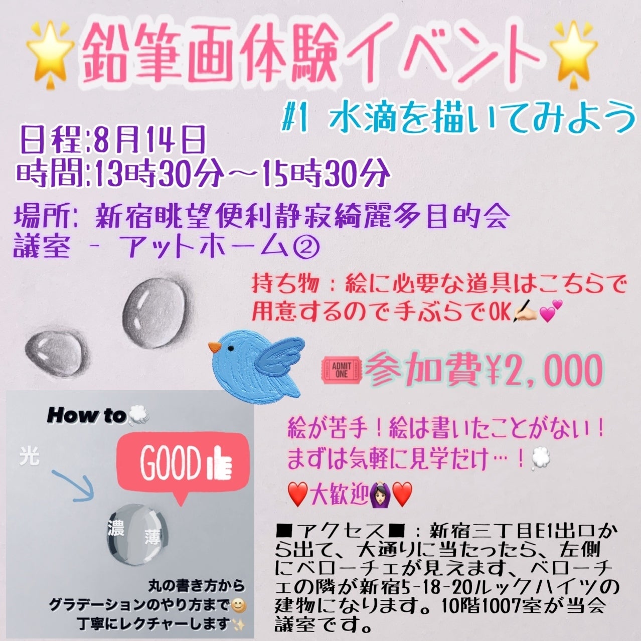 2021/06/29 07:23おひさしぶりです!舞織-maori-です。フリーランスの鉛筆画家として、日々活動させて頂いています。まだまだ修行中です!オンラインレッスンなどを通し、技術向上できるように、練習しながら、絵の制作をしています。こんな絵を練習しています↓↓↓突然ですが!私には夢があります。全国各地で、絵のイベントや、個展を開催することです。東京、大阪、名古屋、福岡、北海道、神奈川、高知、沖縄、京都、金沢、仙台、群馬、etcたくさんの場所でやりたいなと思っています。そしていつか新聞やテレビに出たい…!絵の先生もちょっと興味ある…!今は基礎練習を頑張り、絵の制作をして、"自分の作品"を描きためて行きたいと思っています。今は24歳ですが、30歳までに、イベントや、個展をできる限り開催したいです。個展をひとつやるにしても、初個展が特に、本当に大変だと思っていて、なかなか開催の目処が立ってないのですが、この度、イベントを開催することにしました!いつも応援してくださる方へ向けて、少しでも絵に親しんで貰いたい!という想いで、また、応援してくださる方と直接お会いして、話してみたい!と感じたので、開催することにしました!場所は東京の新宿、※この建物からは実は母校が見えるんです(笑) 日程は8月14日の13時半~15時半を予定しています。チケットはBASEのショップから購入頂けます!誰も来なかったら悲しいので、どうか!1人でも多くの方のご参加をお待ちしております!🎟チケット↓↓↓【鉛筆画体験ファーストイベント】#1 水滴を描いてみよう!8月14日参加チケット | マオリアトリエ https://thebase.page.link/1rjp @BASEecよろしくお願いします( *ˊᗜˋ* )!皆様にお会い出来るのを楽しみにしています!舞織-maori- もっと見る