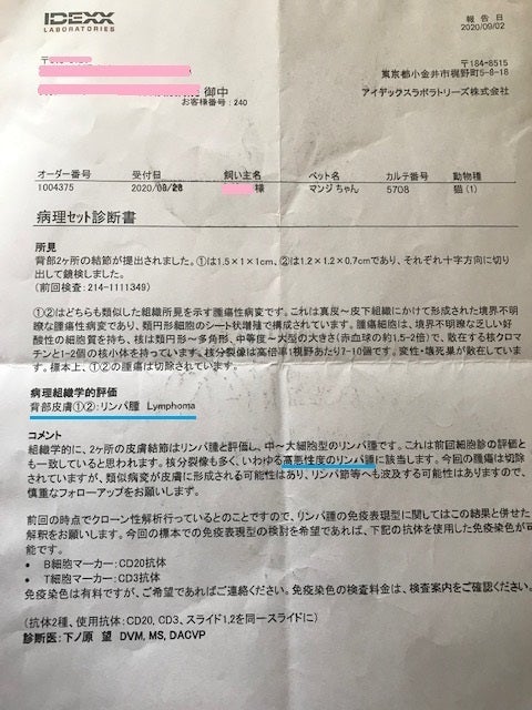 2020年8月25日 検査の結果、皮膚型のリンパ腫、悪性度の高い低~中分化型である可能性が高いとの診断でした。細胞が少し特殊な形をしている部分もあり、より確実に判断するには腫瘍を切除し改めて検査に掛ける必要があるとおっしゃられました。また、先生と今後の治療について相談させていただきました。