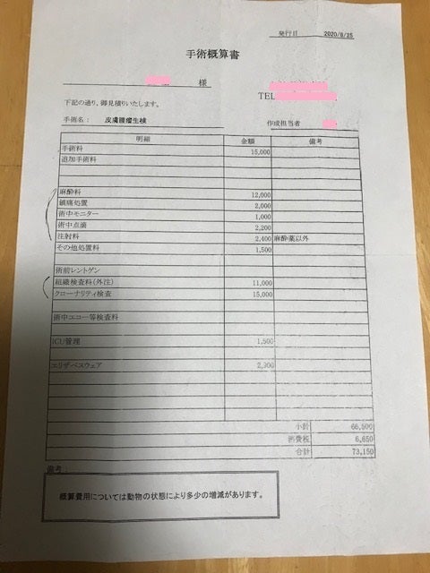 8月19日 動物病院にて針細胞診、血液検査、検査センターへ細胞検査依頼を行いました。