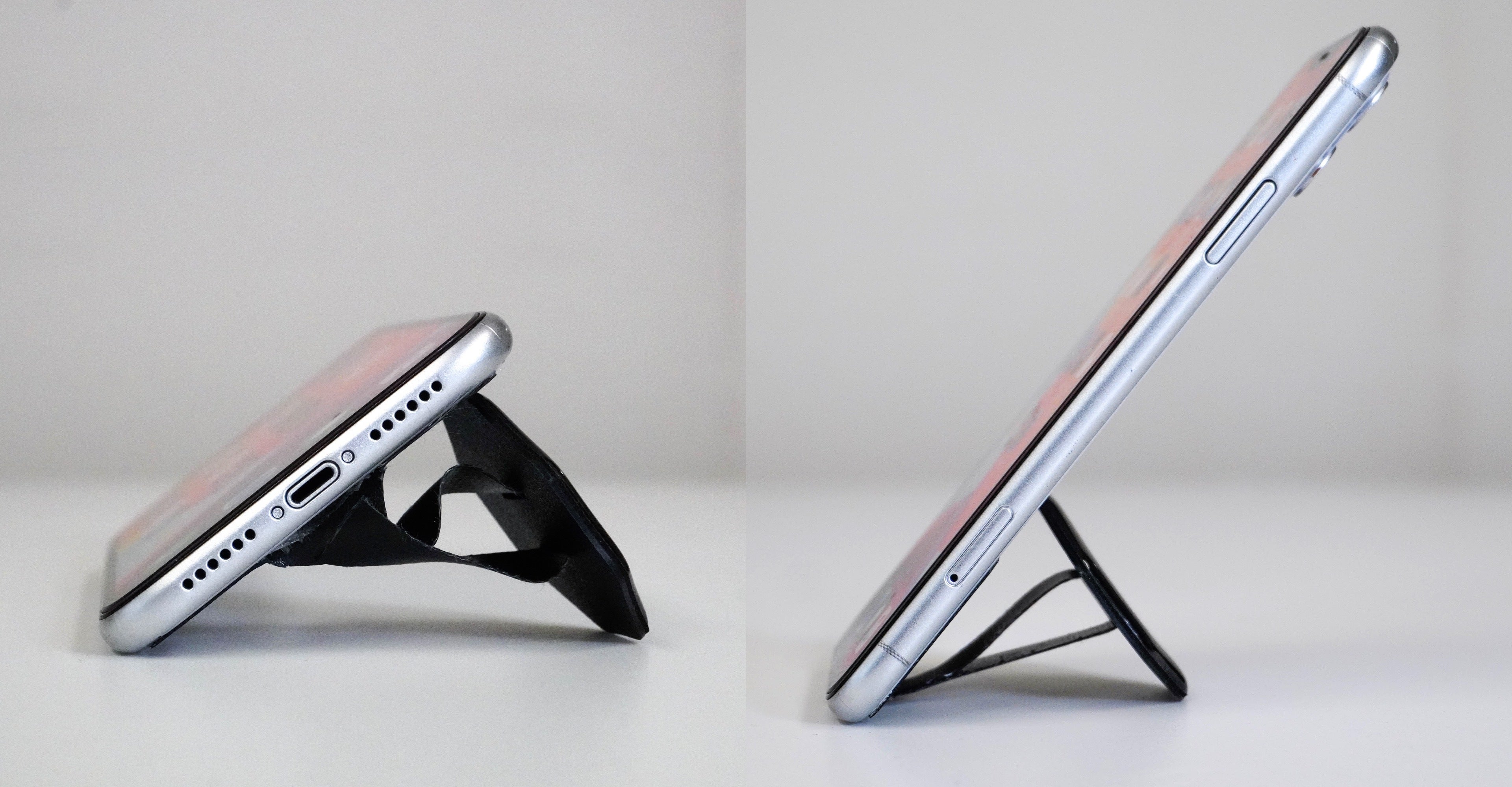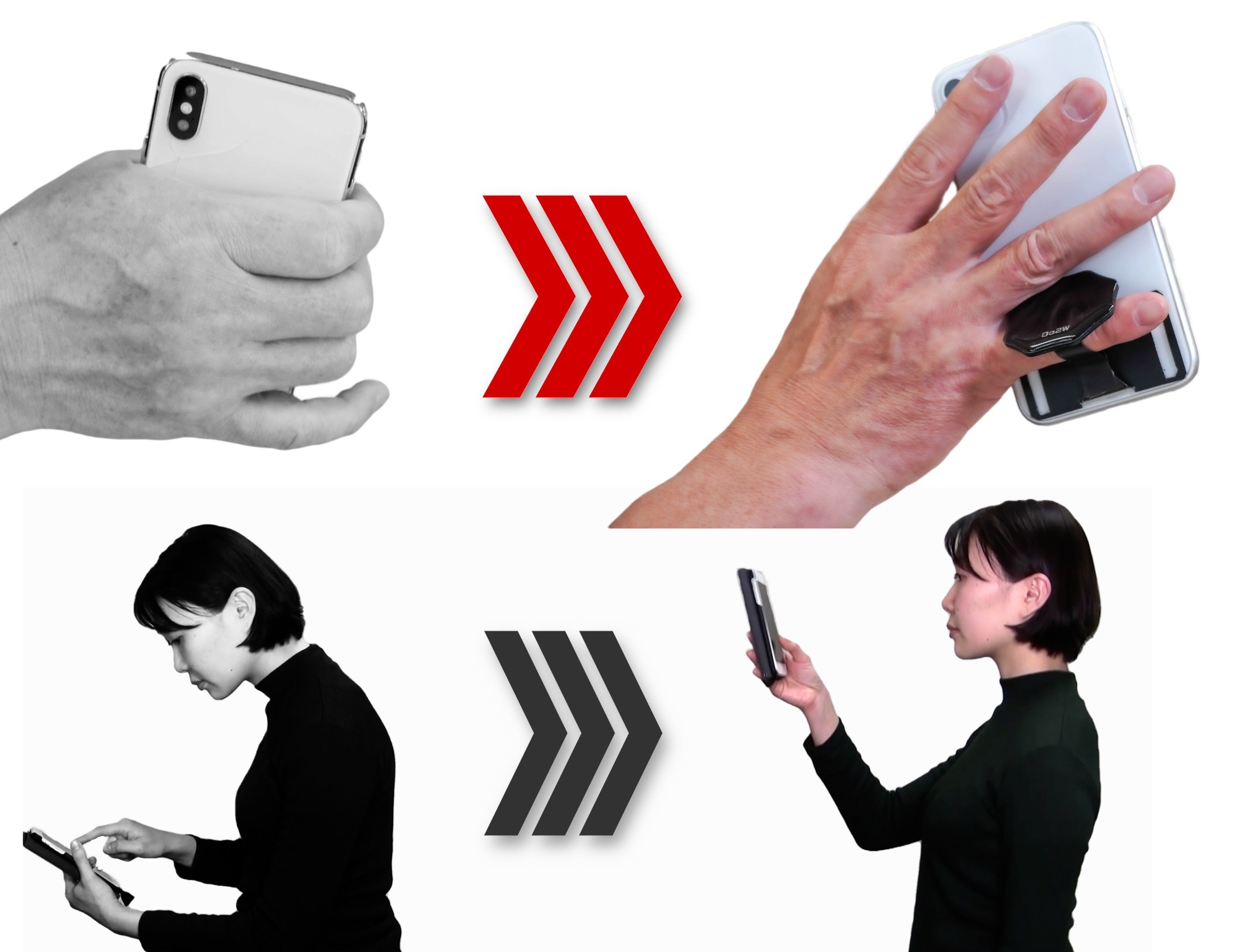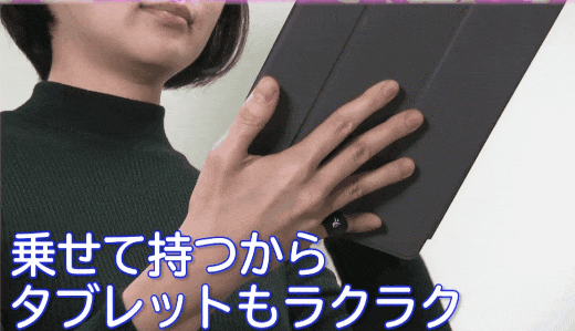 上左図のように”リングがなくても底面で持てるじゃん!”と思う方もいるかもしれません。しかし、スマホやタブレットの持ち方によっては、昨今話題の「スマホ首」や「テキストサム障害」になってしまうことも・・・。特定の指に負担をかけすぎないように、指に優しいシートを使い、ときどき持ち方を変えたり休憩を取ることが大事です。
