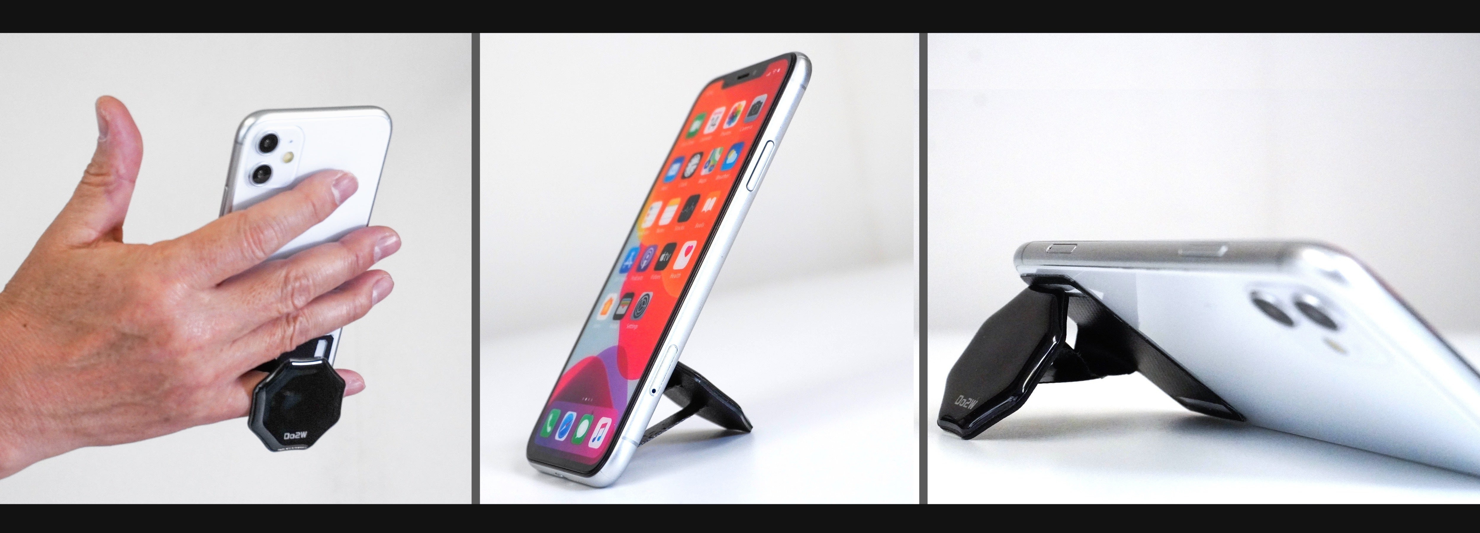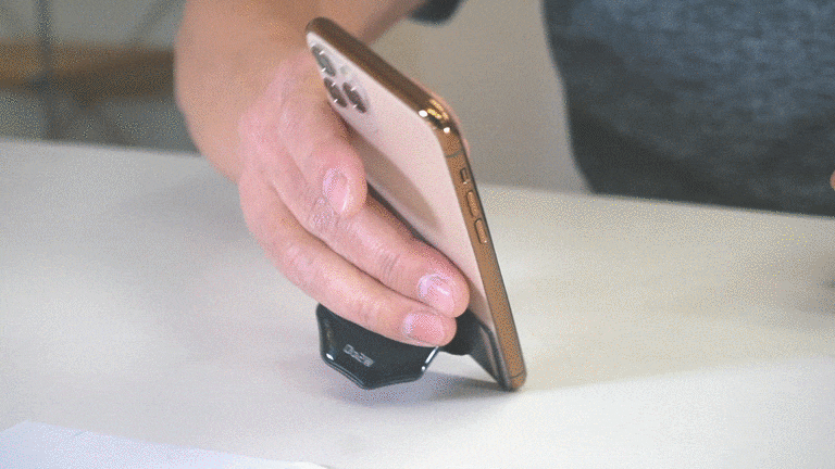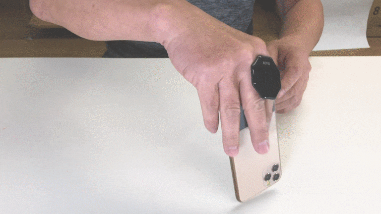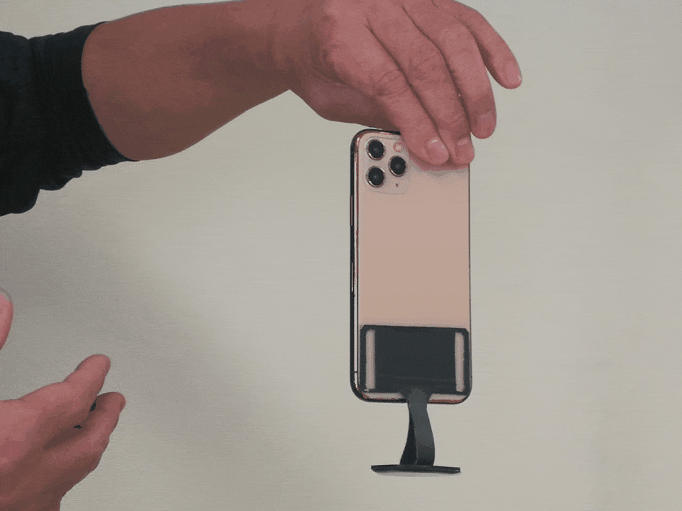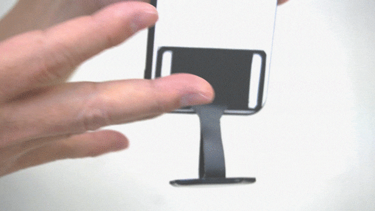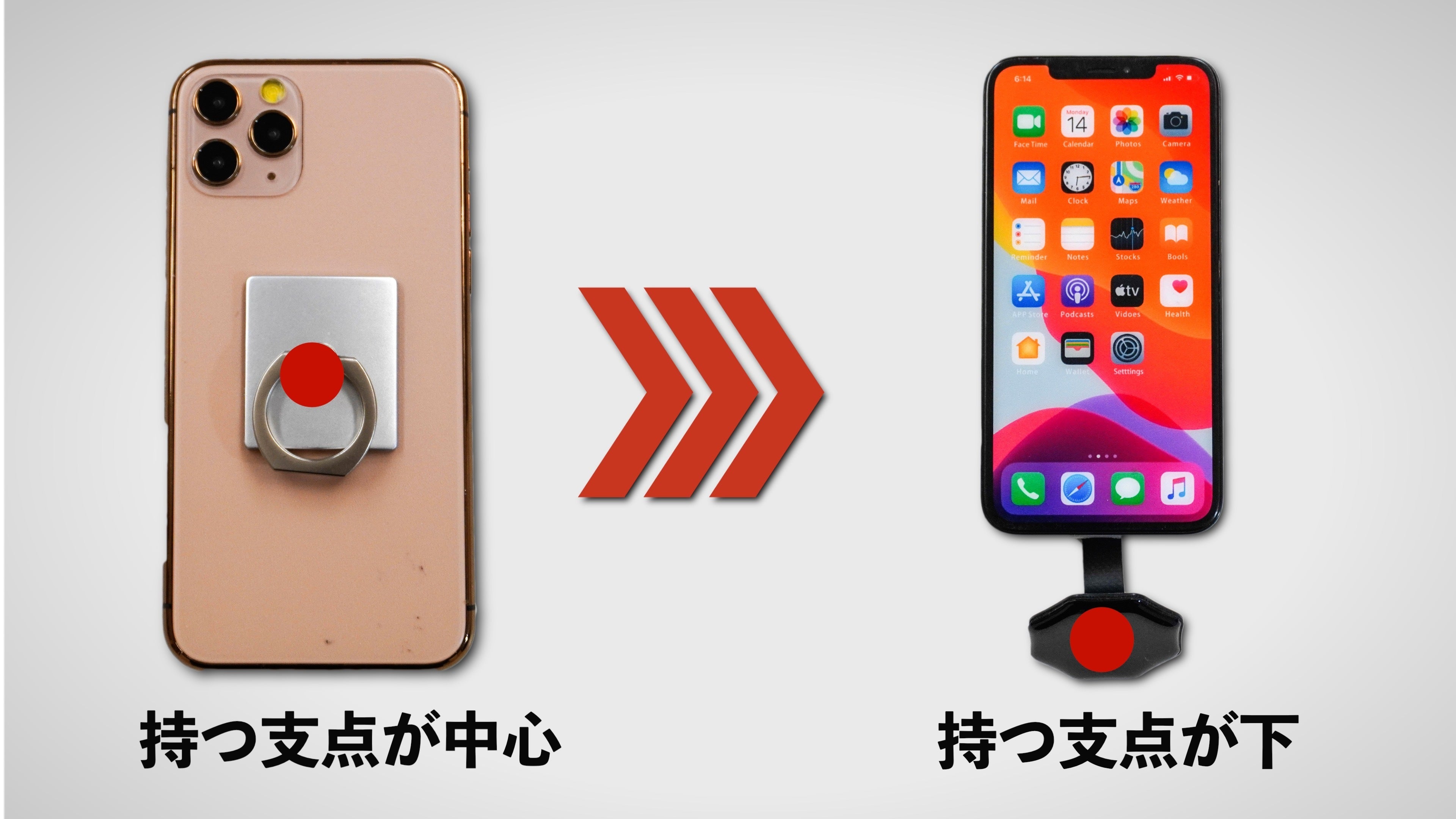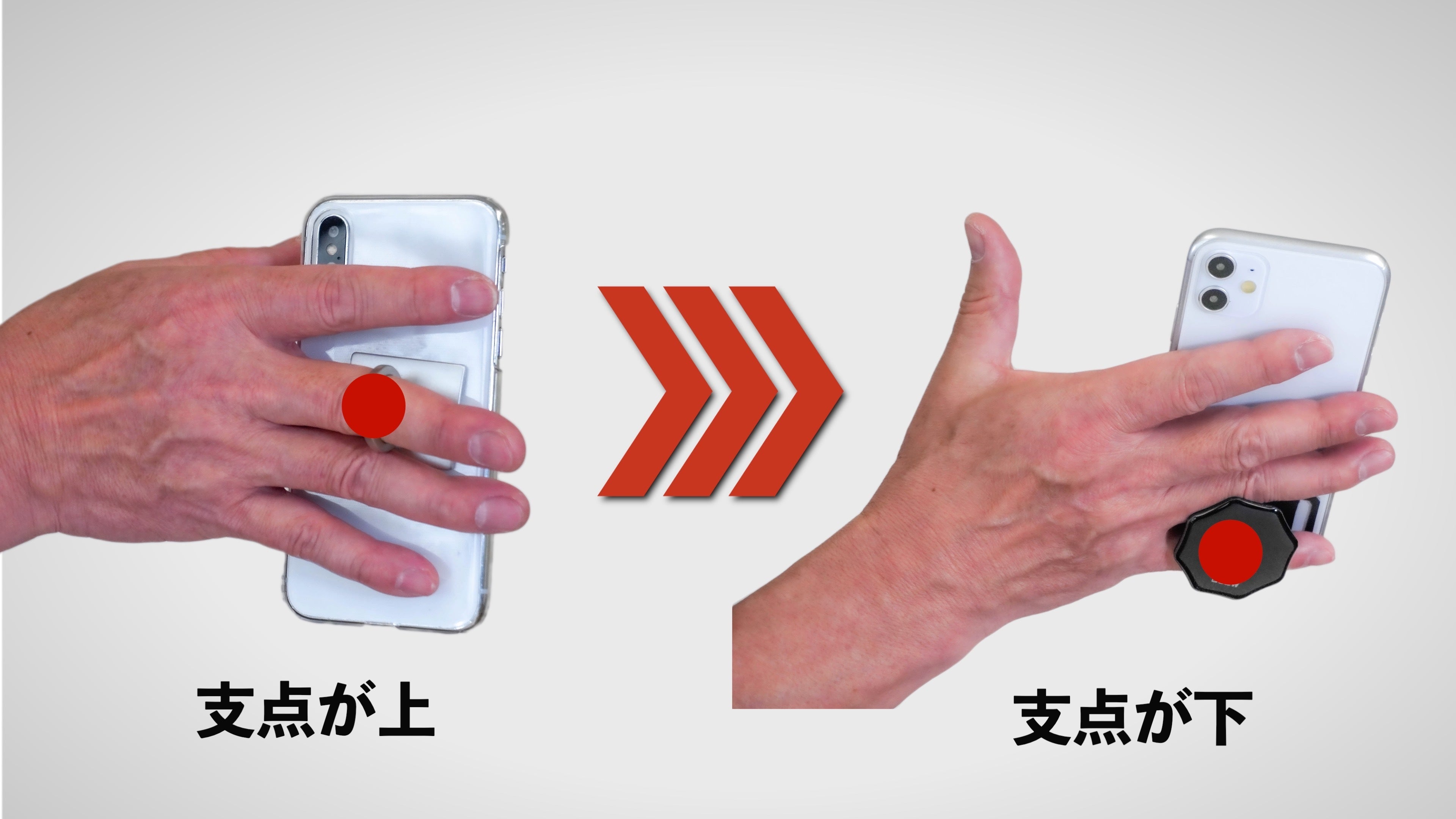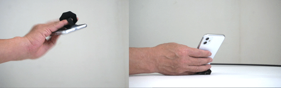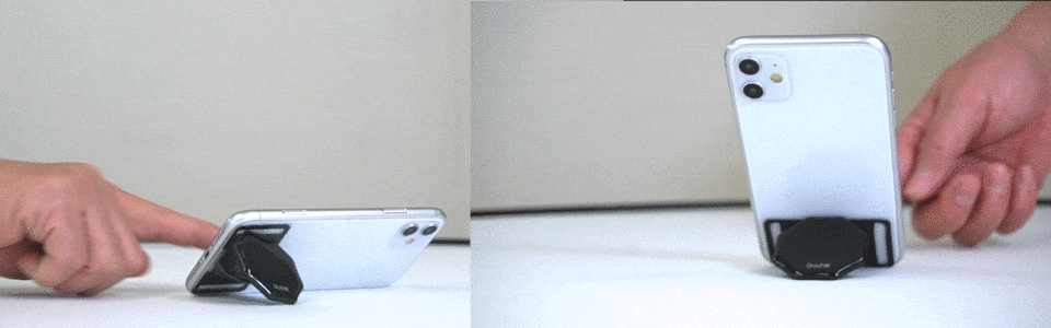 ”底面型”とは、従来の支点が上部分についているスマホリングと違い、スマホの底面から保持するタイプのリングのことです。"底面型"にすると、今まで実現がむずかしかったさまざまな操作が格段にしやすくなります。