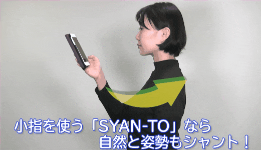 従来のスマホリングは、人差し指で握って持っていました。人差し指はお腹と連動しているので、人差し指で握って持つとお腹に力が入り姿勢が丸まりやすくなります。しかし、SYANTOは小指を使い、背中の筋肉を連動させるので姿勢が起きやすいです。また、小指と背中、肩甲骨等の体幹は連動しています。これによって、スマホやタブレットが軽く感じるでしょう。
