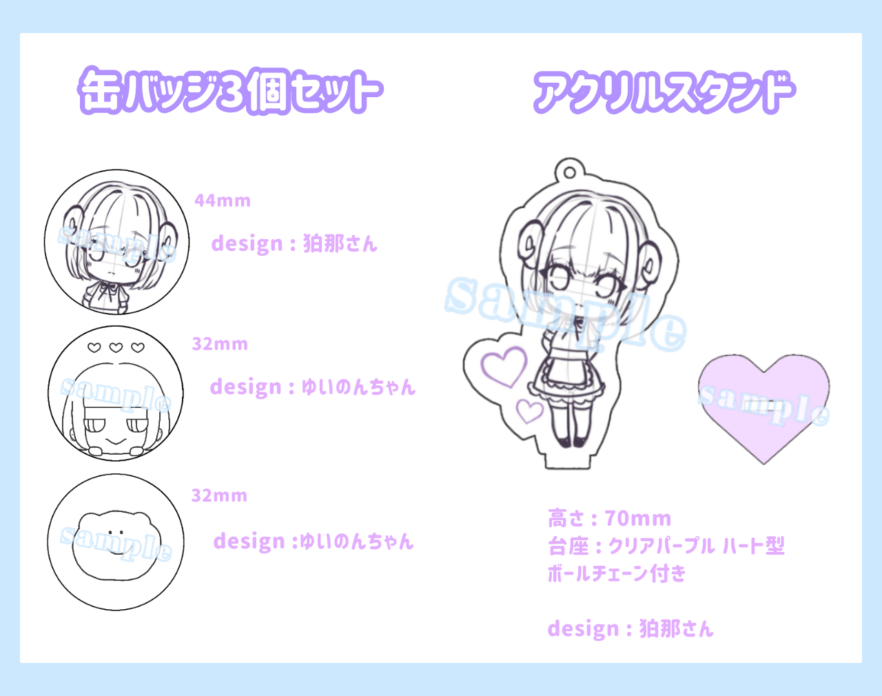 32mmの缶バッジ2種をゆいのん、44mmの缶バッジを友人の狛那さんがデザインした3個をセットにしたものです。