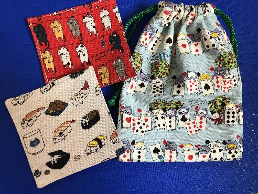 猫柄コースター2枚と猫柄きんちゃく袋1枚 (きんちゃく袋の柄は1種です)