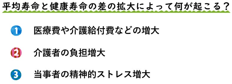 今後も、平均寿命と健康寿命の差が拡大していくと以下のようなことが起こる可能性があります。