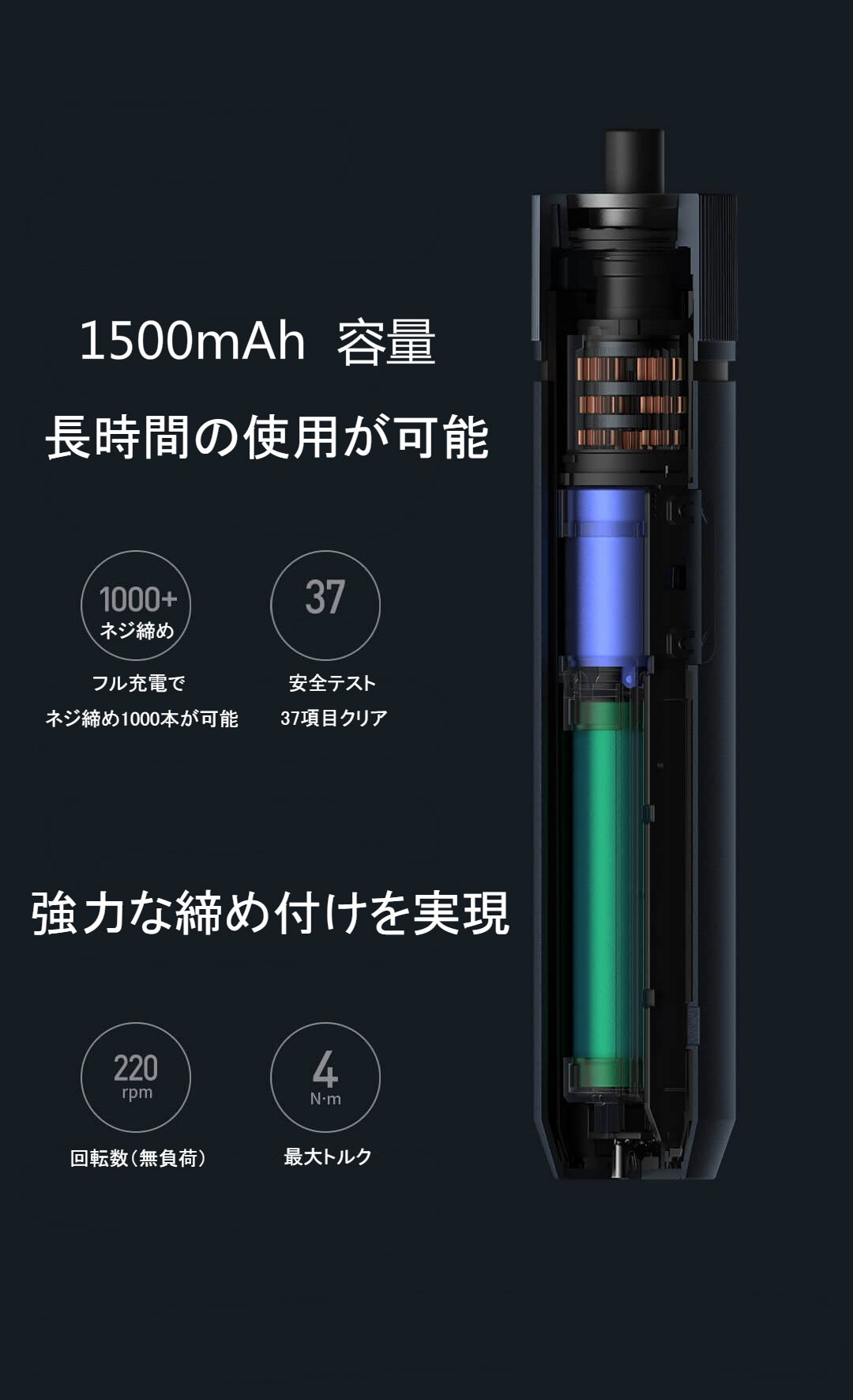 大容量の1500mAhリチウムバッテリーを使用しており、満電状態では約ネジ1000本を取り外し可能になります。