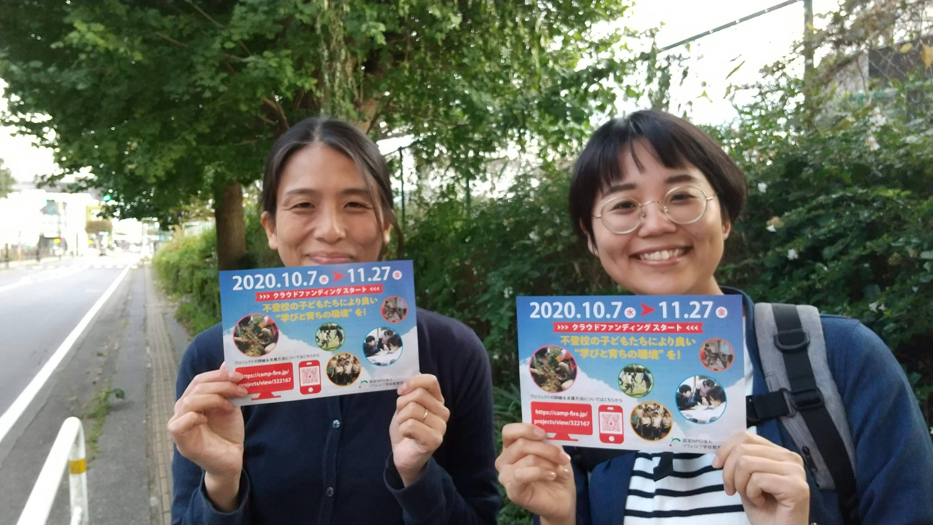 江本さんに記事用の写真を撮影していただいて、「さようなら〜」「これからもよろしくお願いします!」と見送って教室に戻った後、「私たちが写真を撮り忘れてる!」と気づいて、走って江本さんを追いかけて道端で撮った写真がこちら↓↓