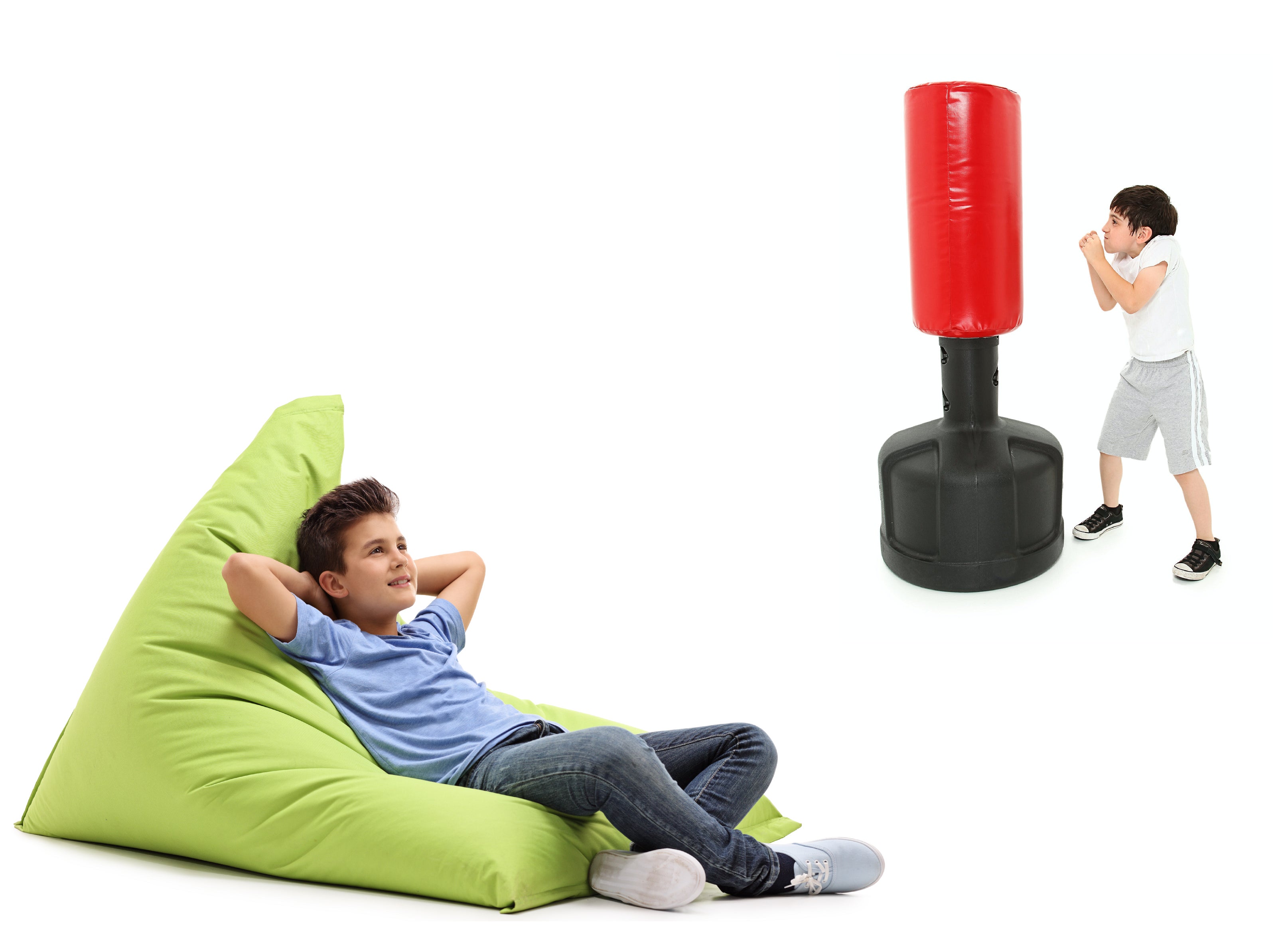 サンドバッグはあり余るエネルギーを発散させ、手足を伸ばして横になれる畳スペースやビーズクッションは、緊張を解き、いら立ちをしずめるための助けとなります。