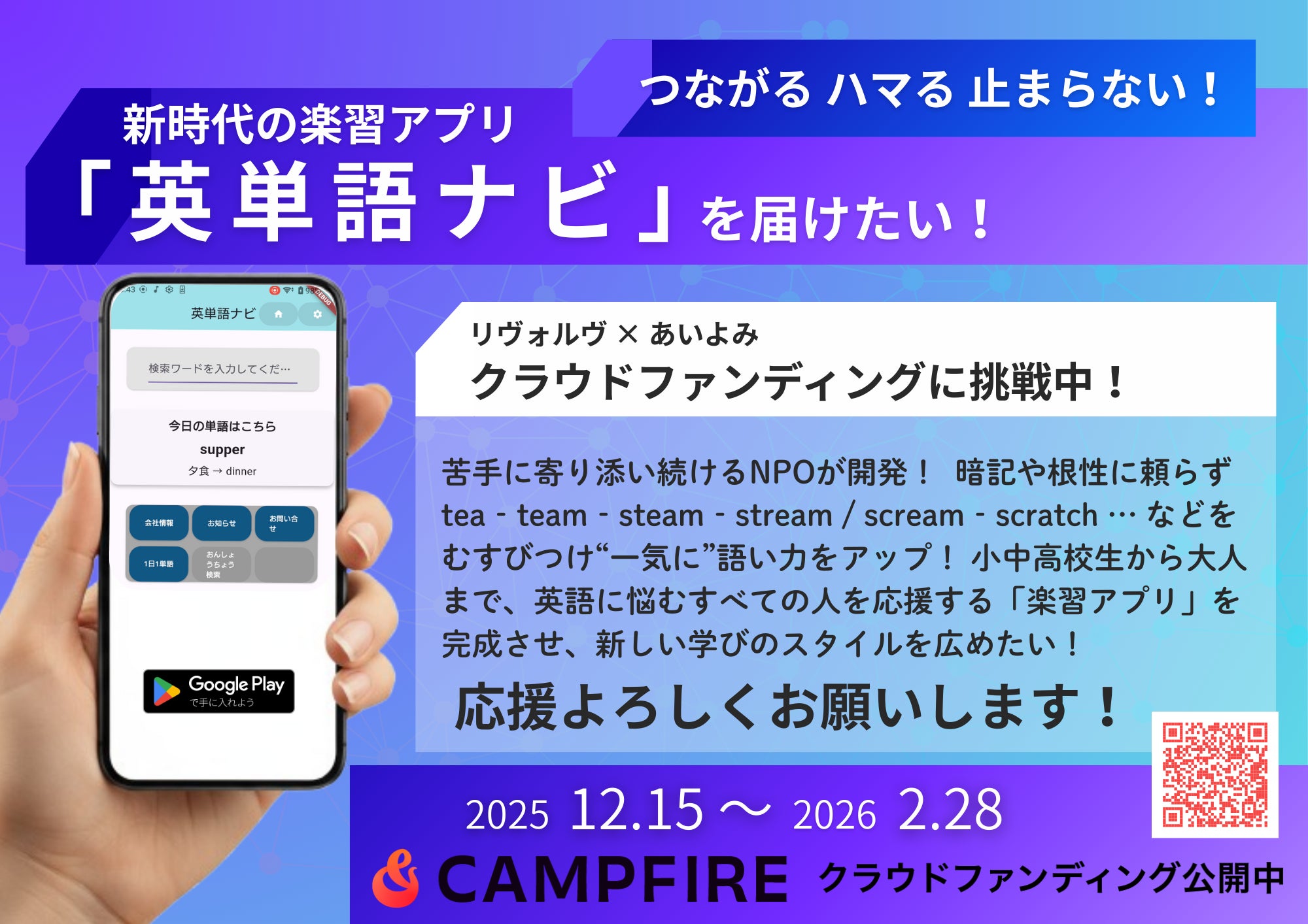 2025/12/12 22:01このたびリヴォルヴ学校教育研究所では、任意団体「あいよみ」と協働し、新時代の楽習アプリ「英単語ナビ」の開発・普及に必要な資金を補うためのクラウドファンディングに挑戦します! 数十年に及ぶ実践と研究の中から生まれた本アプリには、強みを生かし苦手をふせぐ工夫をこらしています。(特許第5492334号・実用新案3184649号) まずは、公開されたプロジェクトページにある「♡お気に入り」をクリックして、応援の第一歩を踏み出していただけませんか?皆さまのクリックが、スタートダッシュの大きな力になります!(※ Campfireアカウントへのログインまたは新規登録が必要です。)公開まであとわずか! 皆さまの熱い応援を心よりお願い申し上げます。+‥‥‥‥‥‥‥‥‥‥‥‥‥‥‥‥‥‥‥‥‥‥+クラウドファンディング 2025年12月15日 〜 2026年2月28日「つながる ハマる 止まらない! 新時代の楽習アプリ「英単語ナビ」を届けたい!」★公開URL:https://camp-fire.jp/projects/902505/view目標金額と用途:ファーストゴールとして250万円 人件費・開発環境整備費・広報費ほか+‥‥‥‥‥‥‥‥‥‥‥‥‥‥‥‥‥‥‥‥‥‥+(下記転送歓迎)--------------------------------------- 「リヴォルヴ学校教育研究所」では、読み書きを苦手とする高専生らによるグループ「あいよみ」と協働し、「楽習アプリ:英単語ナビ」の開発と普及を目的としたクラウドファンディングつながる ハマる 止まらない! 新時代の楽習アプリ「英単語ナビ」を届けたい!を立ち上げました。 私たちの教室には、英語を大の苦手とする子がたくさんやってきます。このアプリは tea–team–steam–stream や scream–scratch などの語を結びつけることで気づきを促します。さらに苦手を支えながら得意を生かすことで、短期間でも効率的に語彙力を伸ばすことができます。経済的な理由で学びの機会が狭められたりすることがないように、基本機能は無償で提供します。その上で寄付を募るなどしながら基金を立ち上げ、学校やフリースクール等における学び支援を充実させるとともに、LDやディスレクシアに限らず、子どもたちの学びと育ちを支える人々の研修機会を充実させたいと考えます。 つきましては、ご支援を賜りたくご案内申し上げます。また、より多くの方々に情報が届きますよう、サイトへの「いいね!」やSNSでの拡散にご協力いただければ幸いです。【プロジェクト概要】+‥‥‥‥‥‥‥‥‥‥‥‥‥‥‥‥‥‥‥‥‥‥+クラウドファンディング 2025年12月15日 〜 2026年2月28日「つながる ハマる 止まらない! 新時代の楽習アプリ「英単語ナビ」を届けたい!」★事前公開URL:https://camp-fire.jp/projects/902505/view目標金額と用途:ファーストゴールとして250万円 人件費・開発環境整備費・広報費ほか+‥‥‥‥‥‥‥‥‥‥‥‥‥‥‥‥‥‥‥‥‥‥+【各種SNS】・Facebook :https://www.facebook.com/NPO.RISE/・X :https://x.com/RISE_tsukuba・Instagram :https://www.instagram.com/revolve298/・note :https://note.com/rise_tsukuba/------------------------------------------------以上 ご協力の程 どうぞよろしくお願い申し上げます。 もっと見る