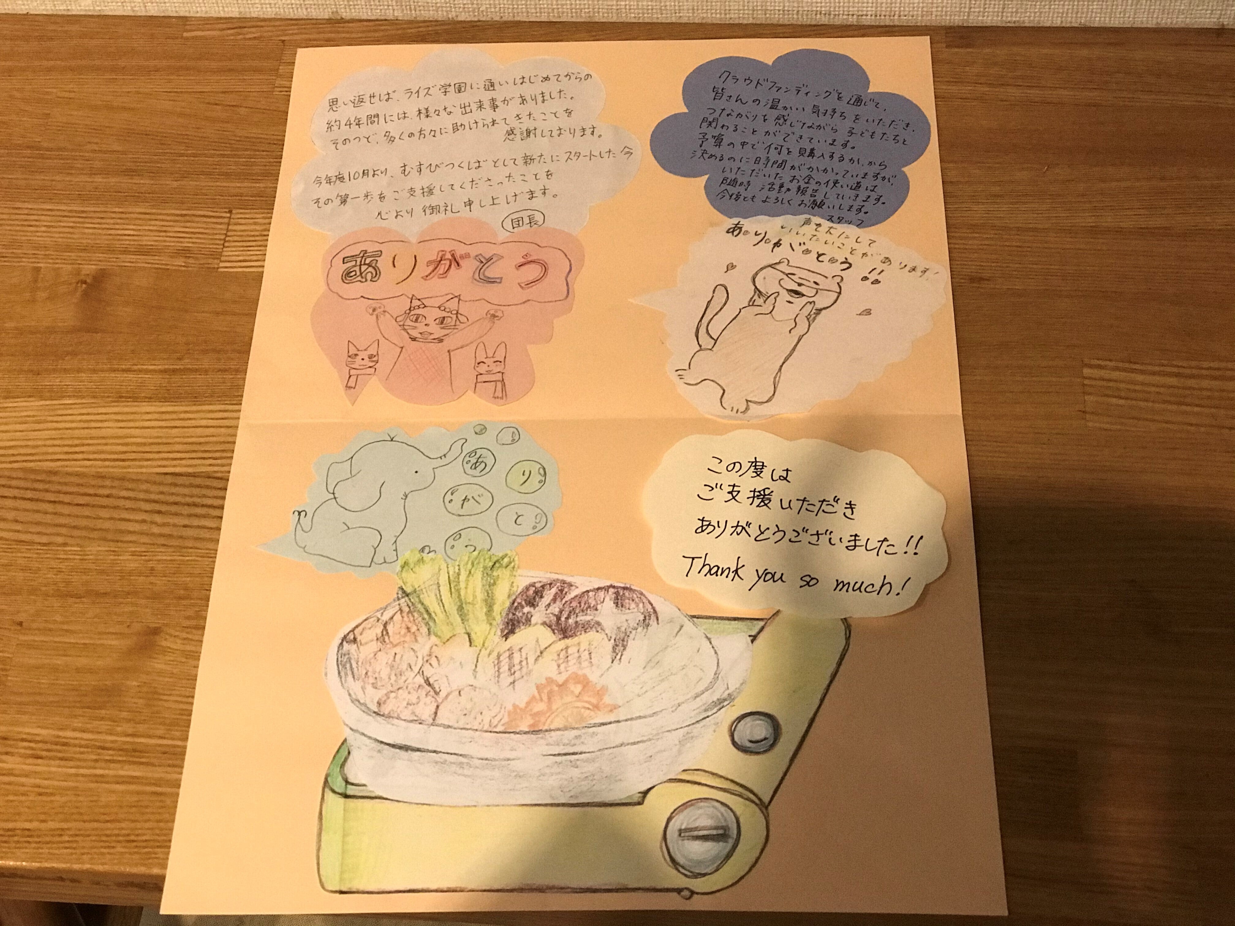 ご報告がおくれましたが、2月初旬にリターンお手紙を発送しました。