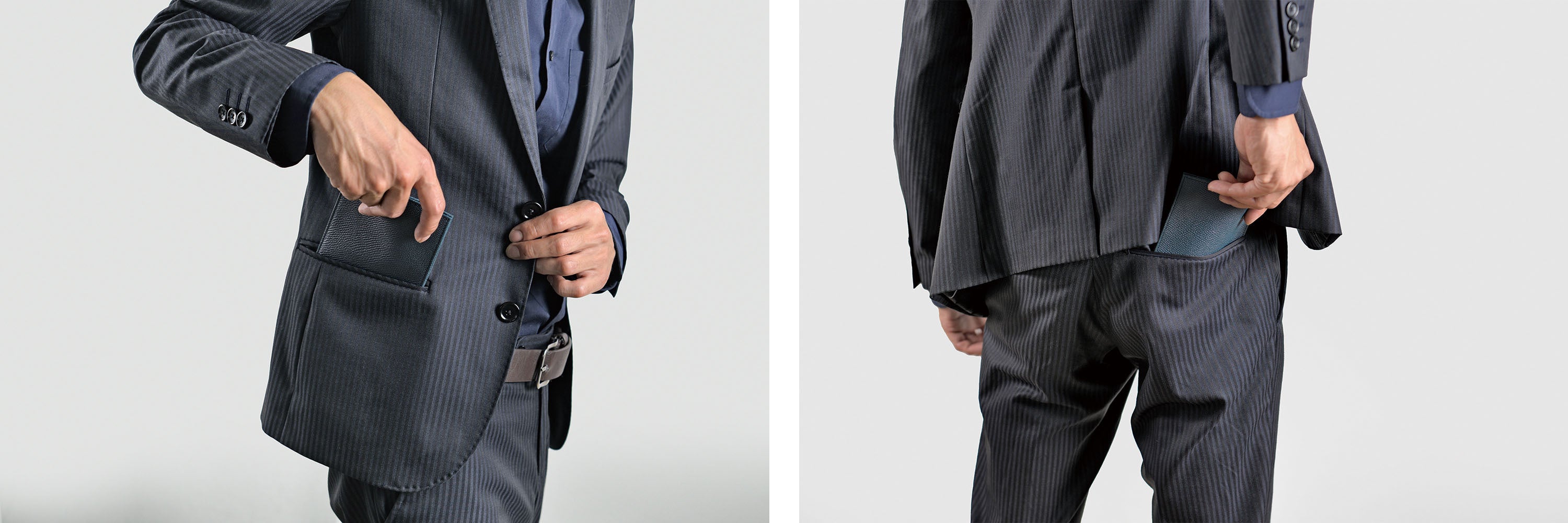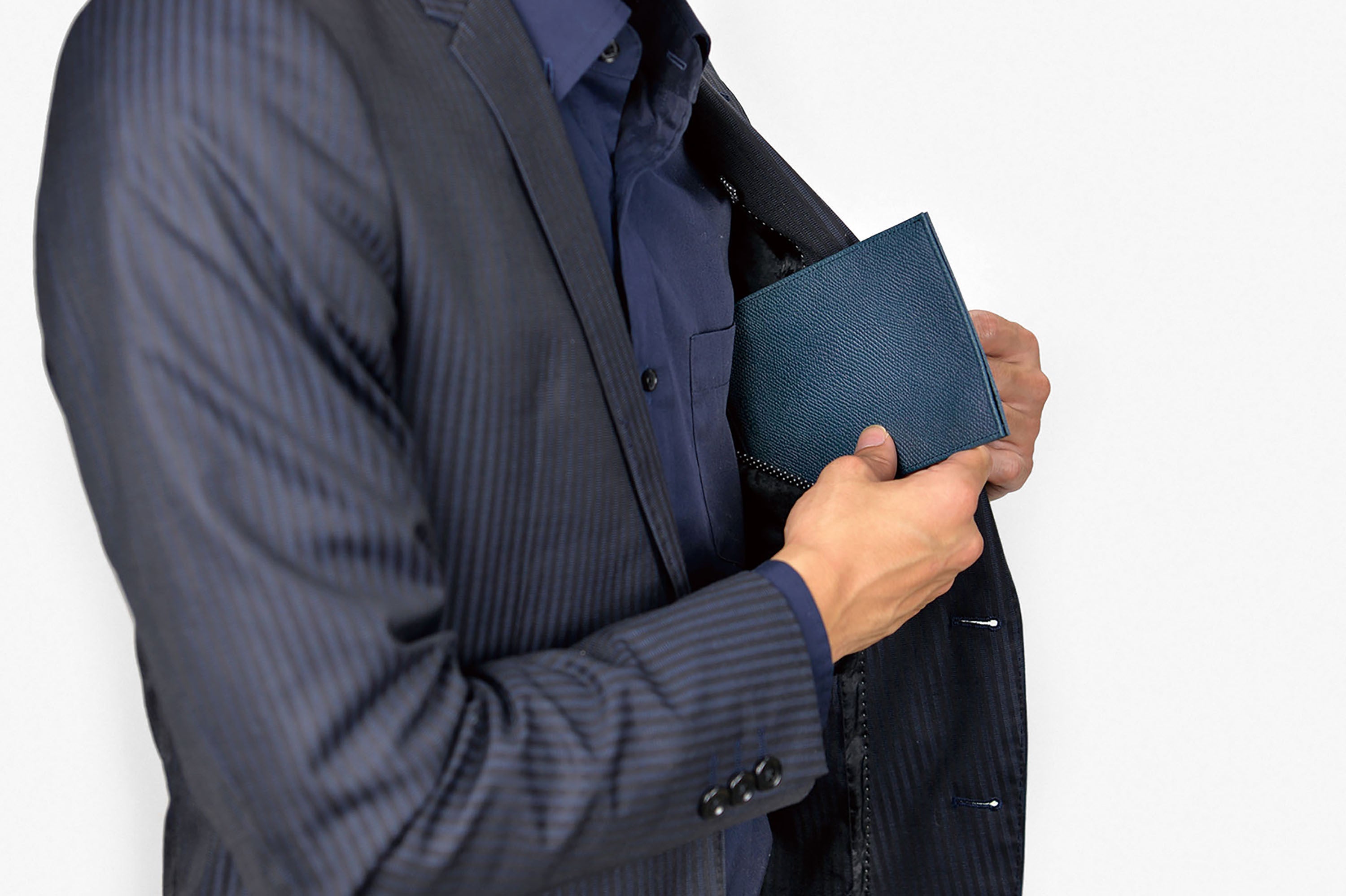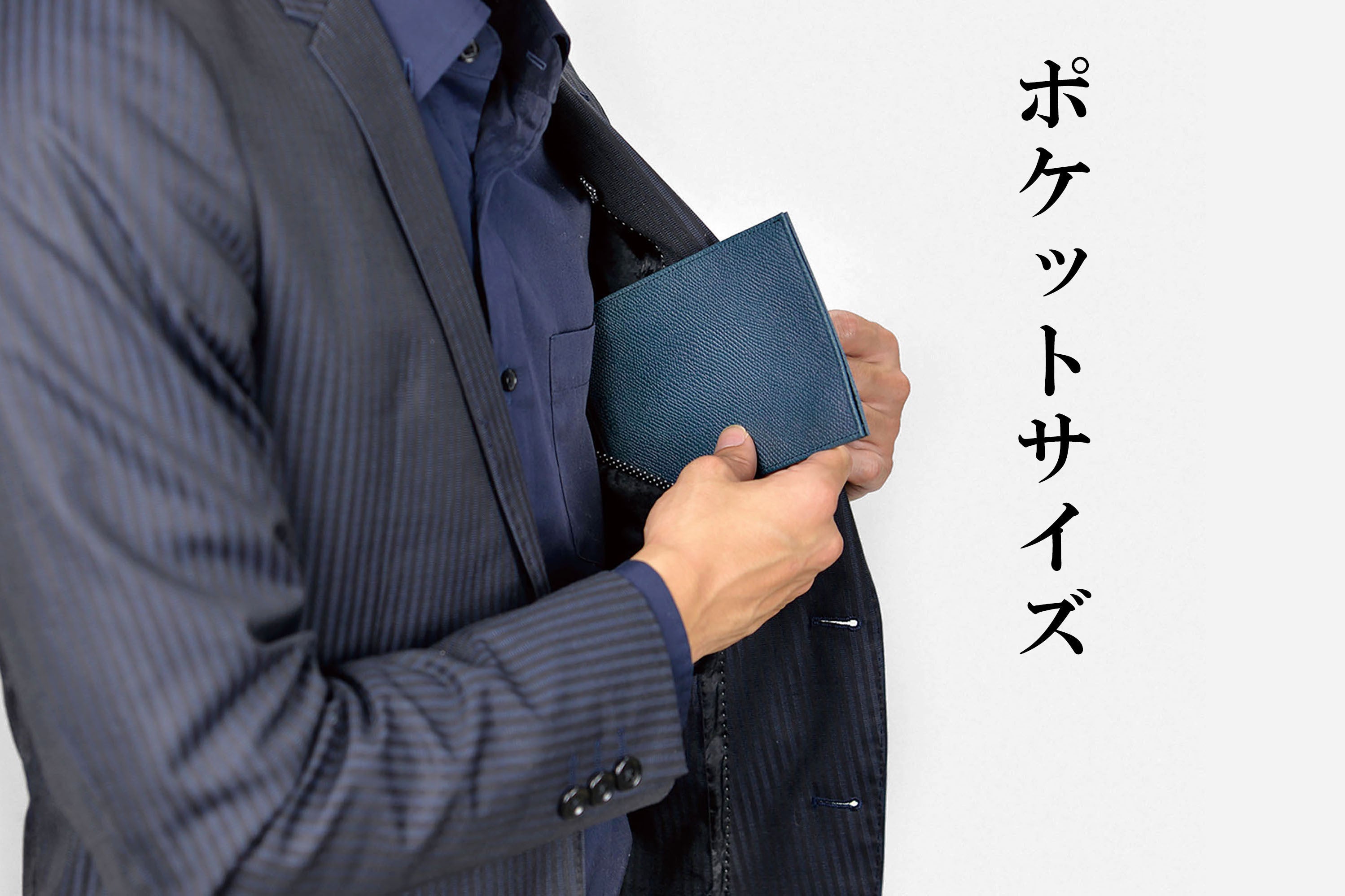 ジャケットの内ポケットにすっきり納るサイズ感。(サイズ:約 W11 × H16 × D0.3 cm)