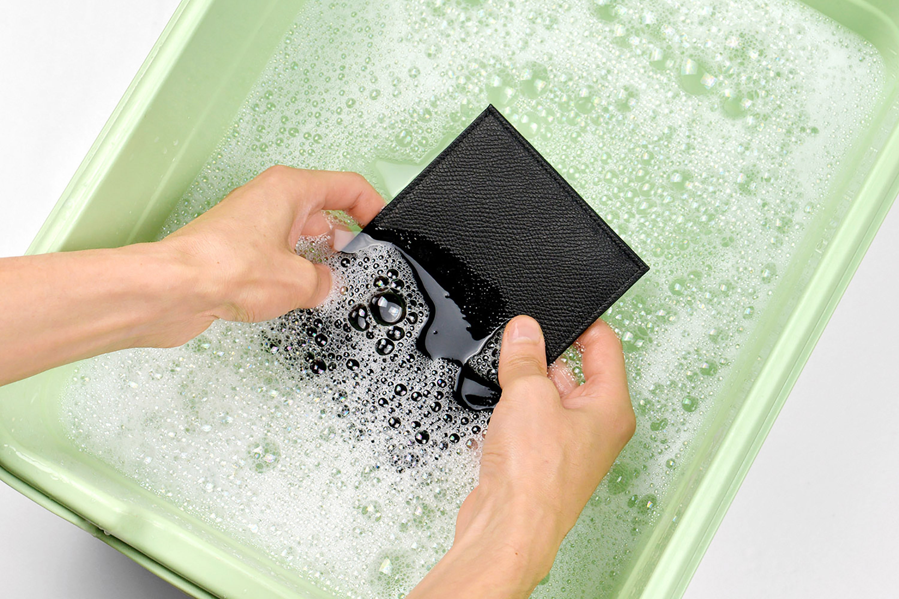 主素材はウォッシャブルレザー。「革は水に弱い」という常識を覆す『洗う』ことが出来る特殊な革を採用しました。