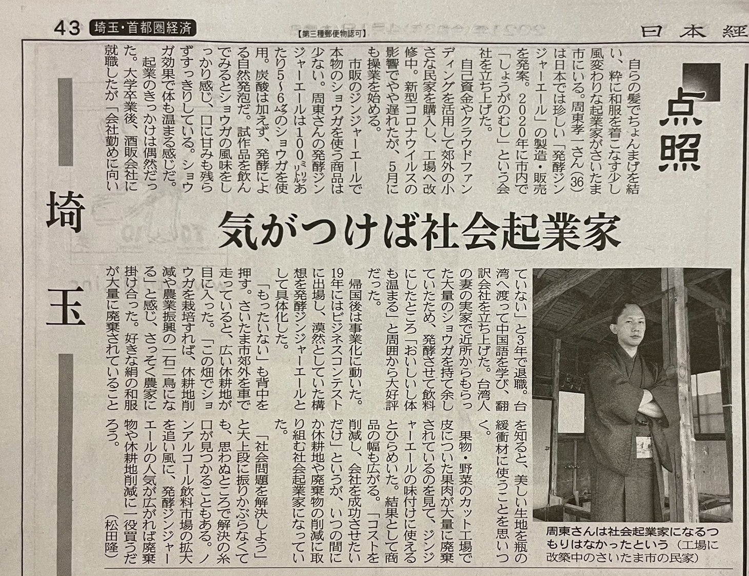 皆様、春ですね!周東は花粉症で辛いので、注射を打ちました。ステロイドが入っていて、なんとなく嫌だったので2~3年打っていませんでしたが、打つと翌日から「昨日までのあれはなんだったの」というくらい効いて、春を満喫できています。(実際は多忙で花をめでる時間など無い…)ステロイドと言っても、数年に一度、このくらいの量であれば身体に影響はないと言えるレベルだそうで、打って良かったです!まぁ、日本の厳しい審査を経て、承認されている薬なので、安心なのは当然ですよね。ところで、日本のコロナ禍は新たな局面を迎えているようですね。日本でも変異株が蔓延し、厳しい状況が続いている一方で、私たちは「新しい生活様式」とやらに悪い意味で慣れてしまっています。今一度、気を引き締めて、予防に努めなければいけませんね。ワクチン接種によって状況は必ず改善しますので、もう少し、踏ん張って参りましょう!閑話休題。◆◆◆発酵ジンジャーエールの配送時期について◆◆◆前回、遅くなるとお伝えしていた発送時期ですが、少し時期が見えてきました。設備メーカーから「4月10日に発送できる」との連絡が有りました。そう、明後日です。おいおい…それじゃ届くの5月じゃん…。。そこから設置やら足りない備品の手配やら、試験醸造やらで、早くても5月下旬になっちゃうんじゃ…という懸念は有りますが、ともあれ、届く時期の目星がつきました。良かった~!^^(…本当はハラワタが煮えくり返りそうですが、ここ数年で身につけた「なんくるないさ~」の精神と、深呼吸で、なんとか自我を保っています。)皆様も楽しみにされている分、残念に思われているかと存じますが、そこをなんとか、ひとつ深呼吸をして頂いて、もう少々お待ちくださいませ。しかしながら「こちとら江戸っ子でい!もう待てねぇ!」という方はご連絡ください。何とかしますので。さて、、前回記載しました、妻子に会えていない問題ですが、解決しました!2週間前に妻と息子が帰国しまして、現在自主隔離の期間も終えて、家族ともども元気に過ごしております。もうすぐ4ヶ月になる息子は、幸いすぐに私に懐いてくれました!急にパパになりましたが、戸惑っている暇もなく、慌ただしく過ぎる毎日を必死に送っております。かわいい息子に、胸を張って自分の仕事を自慢できるような父になりたい、との一心で努力しています。ところで冒頭の画像についてですが、わたくし、天下の日経新聞に掲載されました!!しかもさいたま支局長じきじきに執筆頂きました!まさに感無量!「社会起業家」だなんて書いてくださり、写真も完全に幕末の維新志士のような出で立ちで掲載されておりますので、ますます精進しなくてはいけませんよね。まだ肝心の醸造・販売もできておらず、何の結果も残せていませんので、嬉しさの反面、恥ずかしさの方が大きいのですが、ともあれ、これを足掛かりの一つに、しっかりと啓蒙を行い、全国に発酵ジンジャーエールのマーケットを作って参ります。発送までもう少しお待たせしてしまいますが、どうか引き続きお付き合いくださいませ。その他の近況:◆市内のフルーツカット工場、子ども食堂やフードパントリーと協力し、フードロスを削減する活動を始めました!規格外のフルーツを発酵ジンジャーエールにも活かせる体制が整いましたので、お楽しみに^^◆今月、同じくCAMPFIRE内で、廃棄される和服を救済するプロジェクトが始まります。私は多忙で手が回らないこともあり、アマネ君という大学生と組んで行っています。この和服は弊社内でも使用します。こちらもお楽しみに^^◆見沼田んぼで借りた休耕地にて、いよいよ4月11日に植付けを行います。生姜だけでなく、柑橘やブドウなどの果樹、限定品に使用するハーブなども植え付けます。手伝いに来てくださる方も募集していますので、詳しくはtwitterをご覧ください^^https://twitter.com/ginger_bug_inc養蜂用の柵や、ブドウ棚も制作します!◆醸造所の目と鼻の先に有る、障碍者の就労支援を行う事業所に、発酵ジンジャーエールの梱包を委託することになりました。弊社の事業によって、少しでも雇用を生み出せれば嬉しいですね^^◆現在、発酵ジンジャーエールを置きたい!販売したい!という企業様が25社にまで増えました。市内のバーから、聞いたらアッと驚くような大企業まで様々です。実際に醸造・販売を始めれば、取引先は加速度的に増えていくと思いますが、皆様の中にも、知人友人のお店で置いてくれるかもよ!というようなことが有れば、是非ご紹介ください^^株式会社しょうがのむし代表取締役 周東 孝一