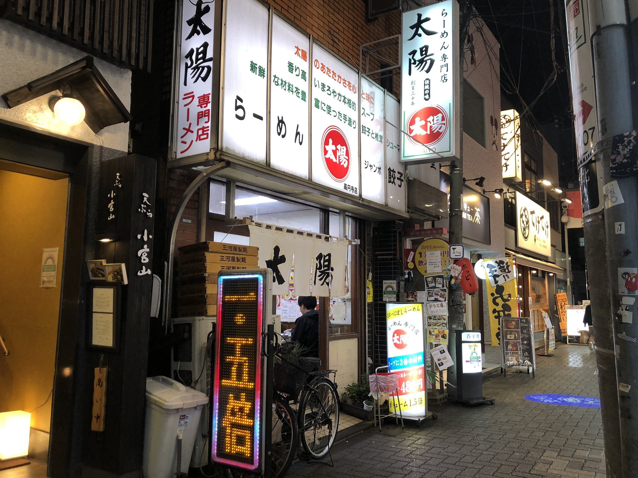 ラーメン屋がビルの1階に隣り合わせで三軒連なっていることから、こう呼ばれていない。駅からほど近く、夜中までやっており、真に飲んだ後にお勧めなのはこちら。なおビルのすぐ脇に味噌ラーメンの“一蔵”、通りの正面に豚骨の“風風ラーメン”、ビルの裏手には“天下一品”が控えており、本当はラーメン6レンジャイである。