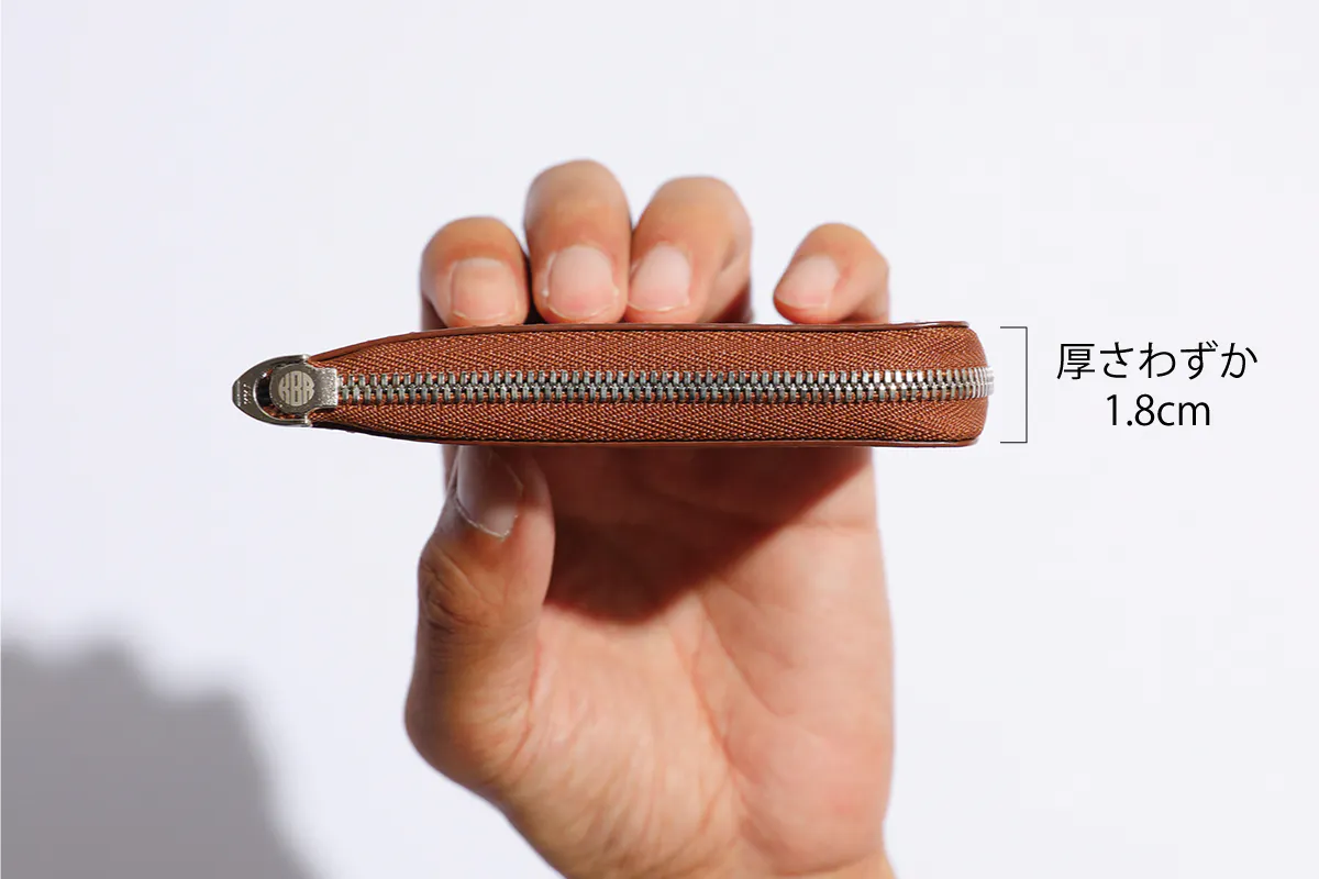 本スマートウォレットのサイズは、横12cm×縦8.5cm×厚さ1.8cmです。『新・日本人の体力標準値』によると20歳男性の標準手幅は9.84cm、手の長さは18.5cm。手にぴったりと収まるサイズとなっていて、片手で持って一瞥確認可能です。また、ジャケットの内ポケットやパンツの尻ポケットにもスッキリ収納できるので、手ぶらで出かけることができます。