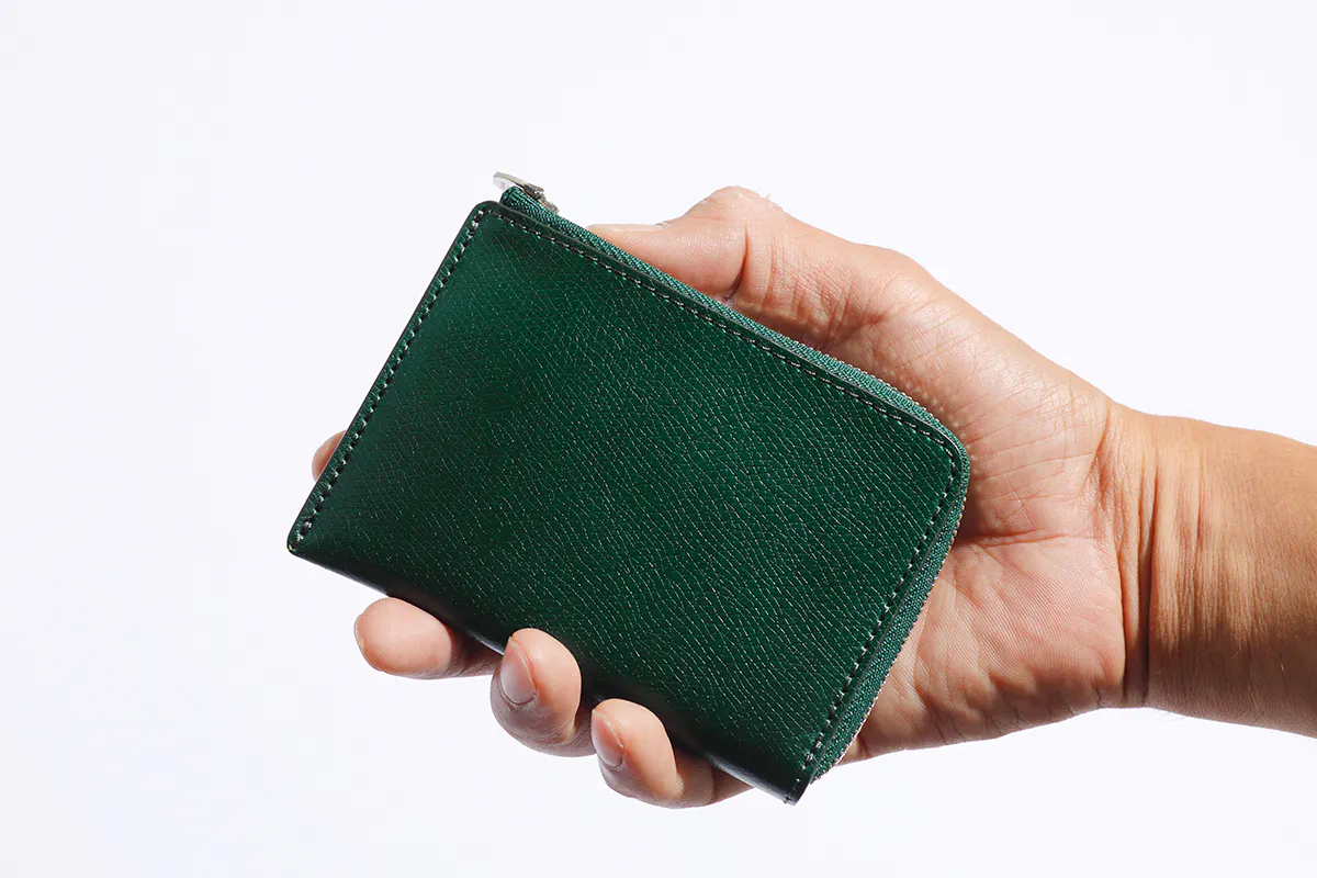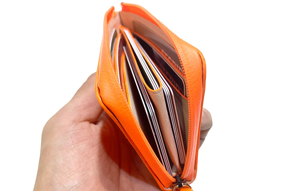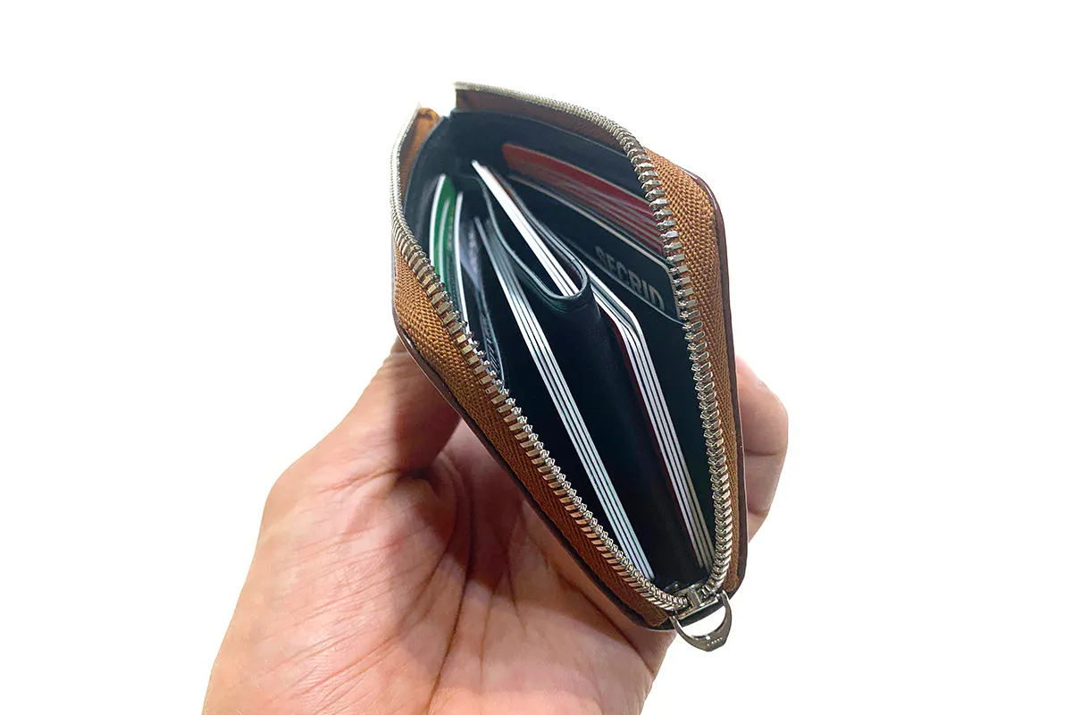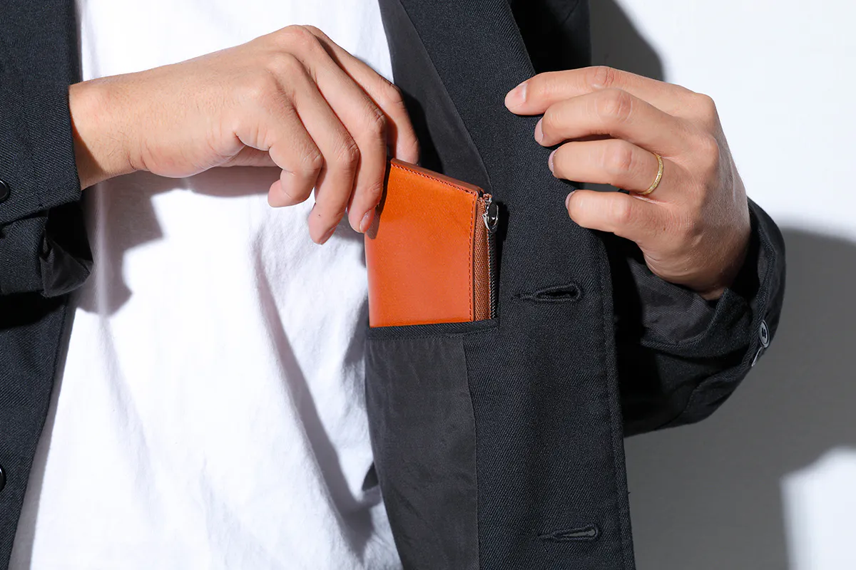 この点はスタッフの経験値から発見しました。硬貨は999円以上になることはなく、うまく使いこなせば15枚以上は必要ないこと。また、プリペイドやクレジットカードのおかげで、必要最低限のお札で事足りることがわかりました。また、カード類についても「保険証」「定期券プリペイドカード」「キャッシュカード」「ポイントカード」の4枚を常備していれば日常生活においてなんの支障もありません。また、「免許証」や「保険証」は、必要なときに家のカード入れから取り出して使うようにすれば、必ずしも常備する必要はないのです。4枚以上常備する場合でも小銭ポケット脇に何枚でも忍ばすことができるデザインになっています。