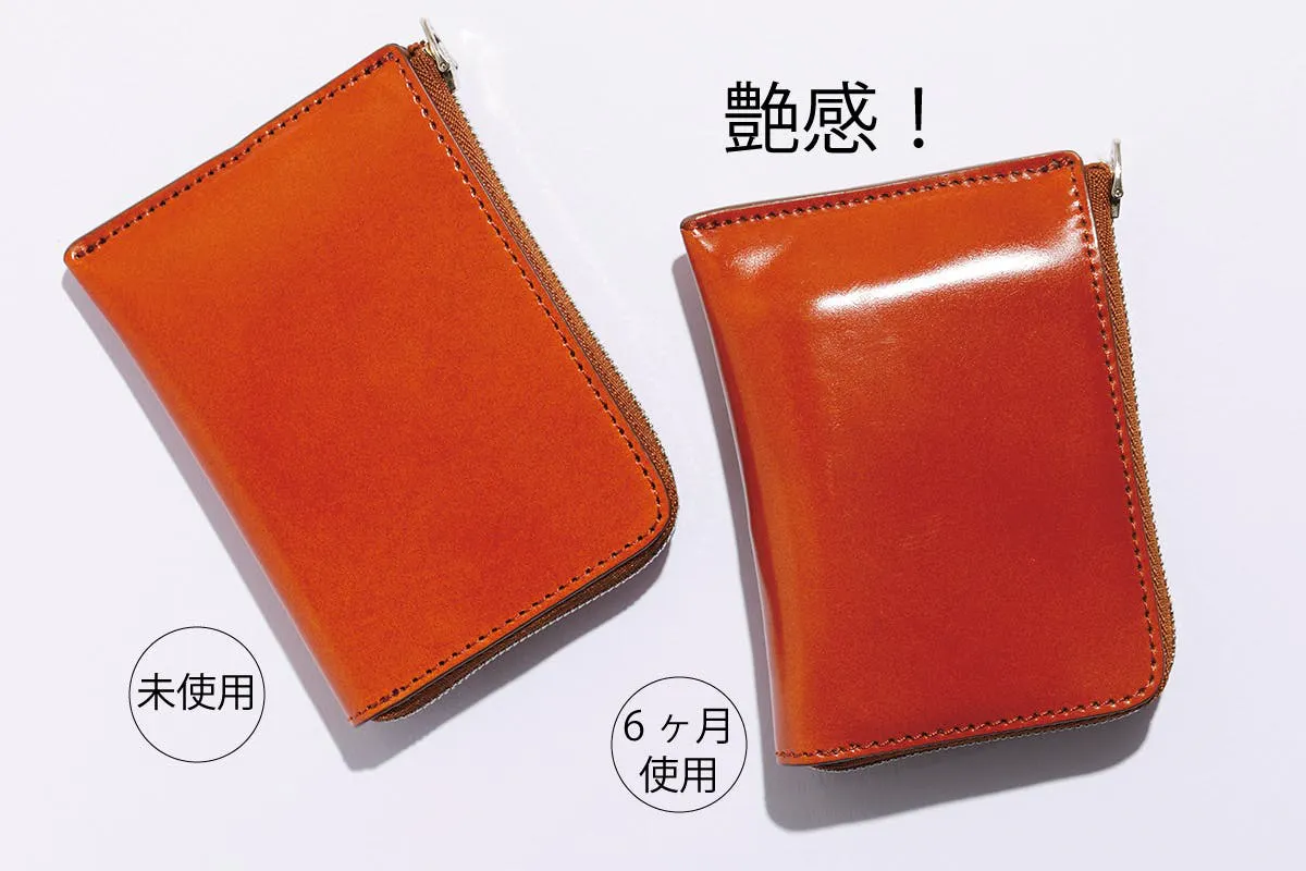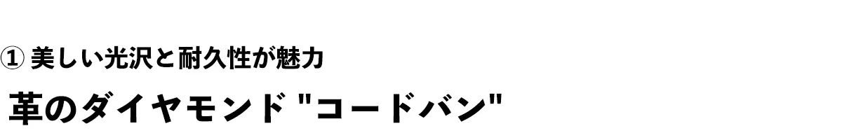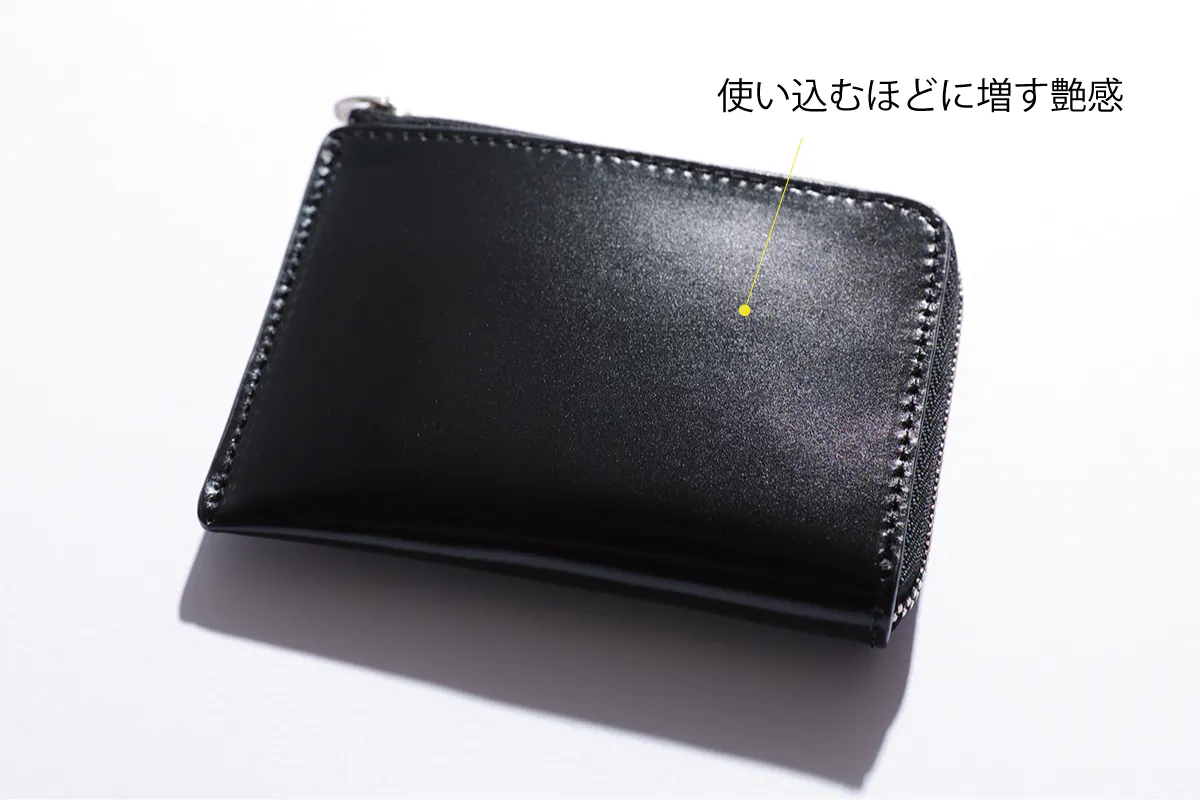 コードバンの魅力はなによりも革のきめ細かな表情が見える「美しさ」に尽きます。使いこなすにつれて光沢感と魅力が増し、牛革の3倍ある堅牢さも特徴で、耐久性が高く、長く付き合う相手としては申し分ない魅力を放つでしょう。ただし、コードバンは水や汗に弱く、濡れたらさっとふき取り、ツヤが消えたらクリームで修復してください。傷つきやすい素材なので、擦り傷がつきやすいですが、これが逆に味となっていきます。そして、使い続けてツヤが増してくると気にならないのがこのコードバンの特徴です。