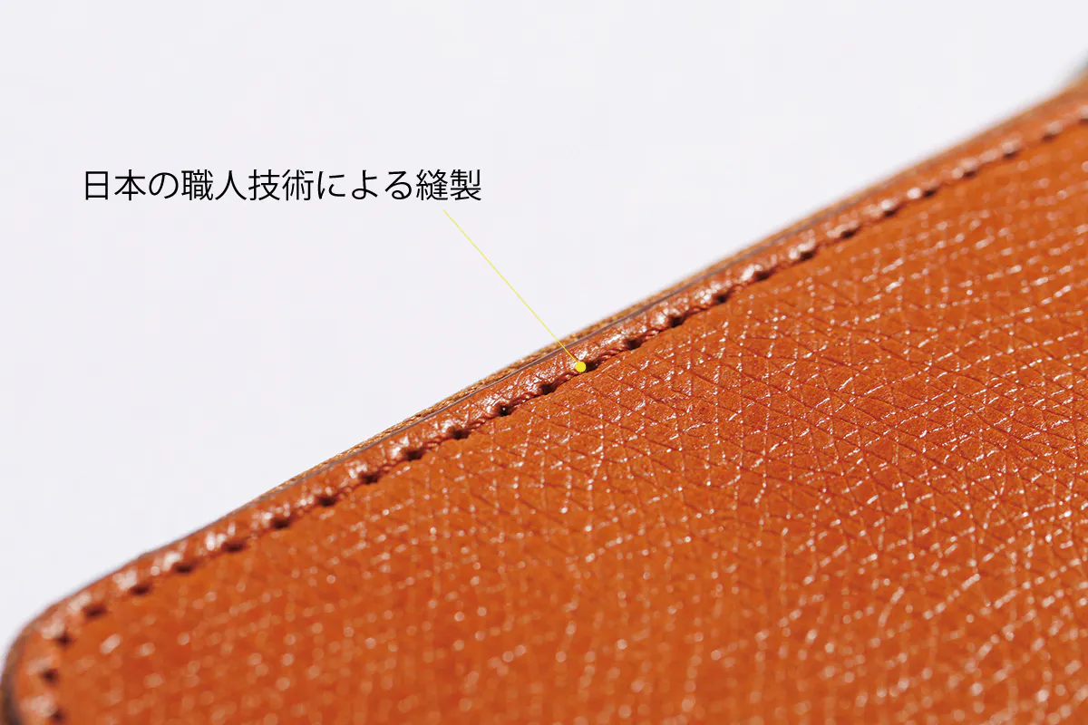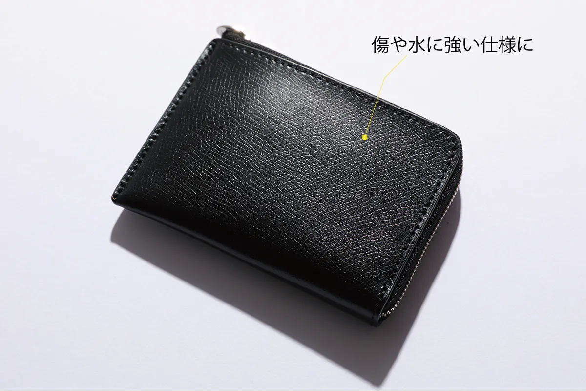 牛革に本エナメルと呼ばれる加工を施しており、本エナメルとは革の表面にウレタン樹脂を吹き付け通常のエナメルより樹脂膜が厚く、より上品な透明感になります。通常の本エナメルはクロム鞣しの革を用い顔料仕上げになりますが、革の厚みを最大限に出すためにベースの革は北米産のタンニンで鞣されたヌメ革を使用しています。ベースの革は強く使えば使うほど馴染み、経年変化もさらに楽しむことができる上質レザーで、手に馴染む感覚を味わいながらより長くご愛用いただけるように仕上げました。
