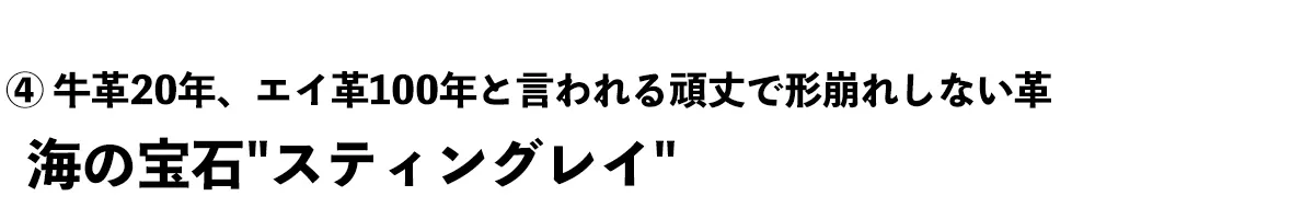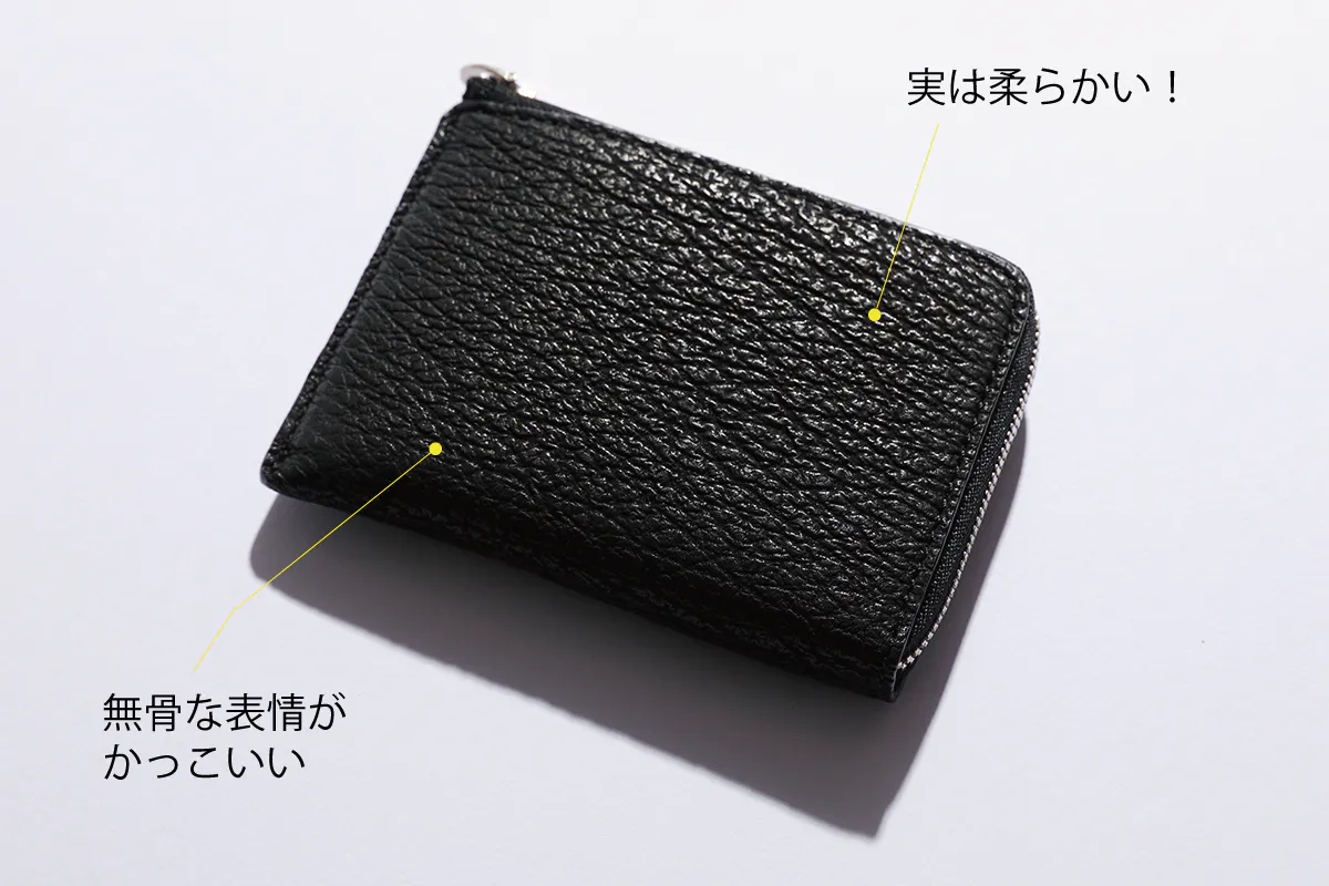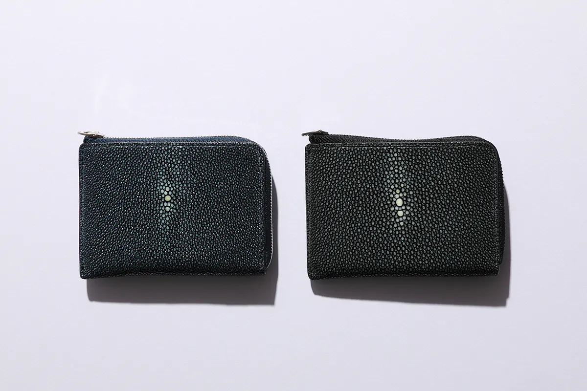 アカエイの皮を加工したもの。ハードな質感と美しいビーズのような突起が印象的な革。牛革の10倍以上の強度があり、長く使いたい人におすすめ。