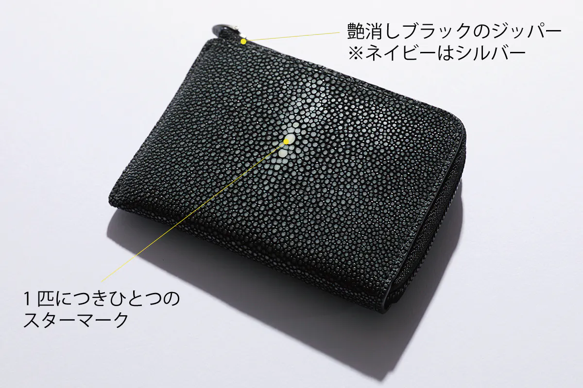 鞣しと染色は、多くの養殖場がある東南アジアでもKUBERA 9981はタイ産のものを使用しています。特徴は、丈夫で水に強く、汚れもつきにくく扱いがラクなこと。エイ革の成分は、人間の歯と同じ成分で、磨けば磨くほど光沢感が出る性質があります。背中の中心に「スターマーク」と呼ばれる白い斑点状の光を感知する第三の目があり、1匹につきひとつしかありません。アジアでは、エイのことを天眼・神の目とあがめられ、開運・金運アップするラッキーフィッシュとも言われる縁起の良い素材として重宝されています。