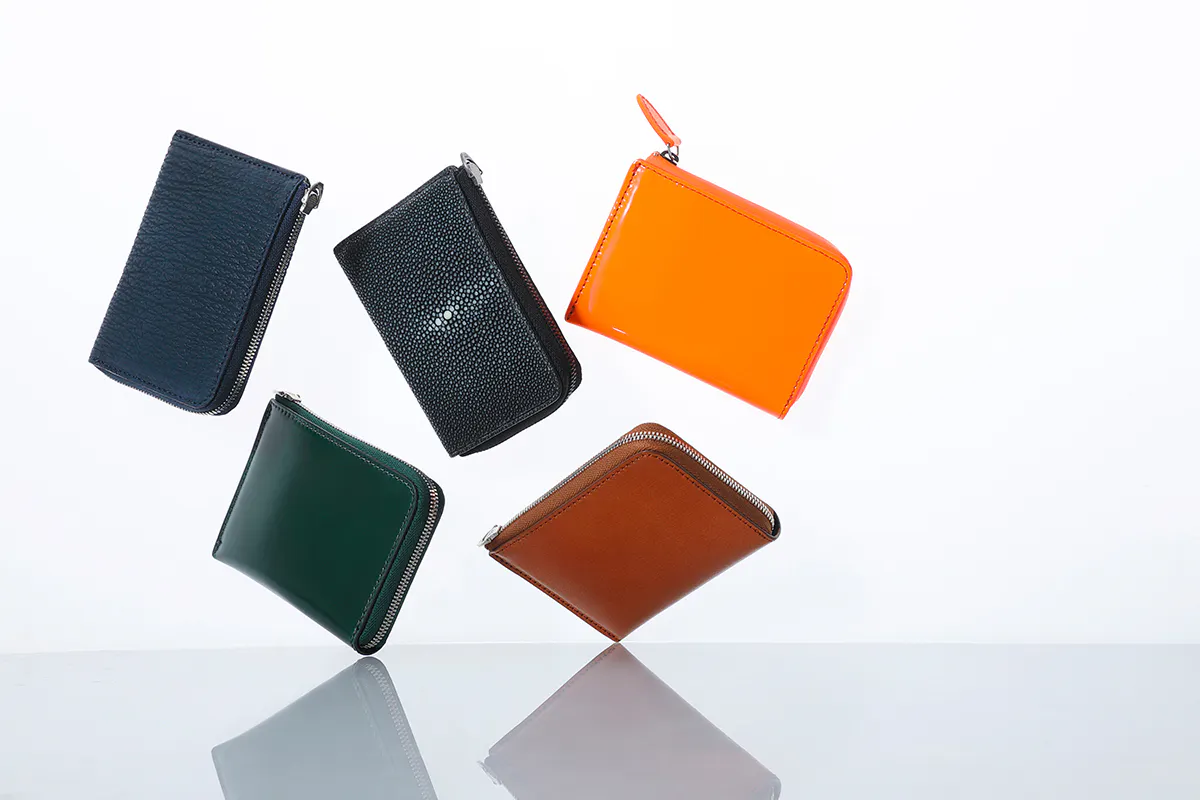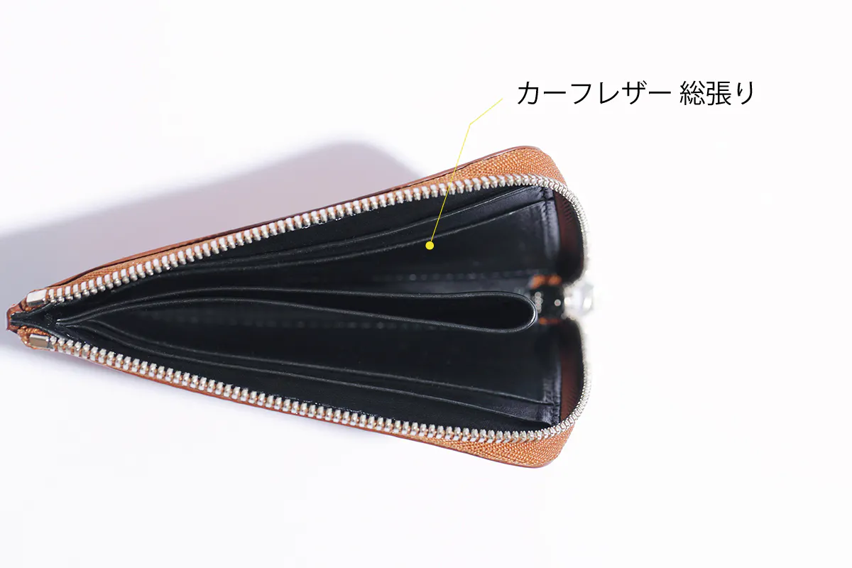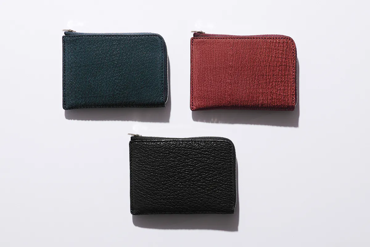 外側は厚く丈夫な革(コードバン【馬革】/シャークスキン【鮫革】/スティングレイ 【エイ革】 /本エナメル【特殊加工した革】 ※それぞれの革に関しては上部にて説明あり)、コイン入れ周りなどの内装はやわらかい革(インド産カーフレザー【仔牛】※本エナメルのみ硬い革【国内産ヌメ革】)を使用。