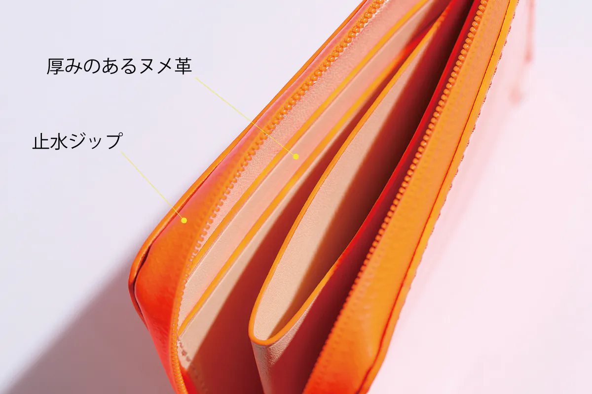 本エナメル仕様のものに関しては、表面加工と同様に水対策としてファスナー部分も止水仕様にしてあります。