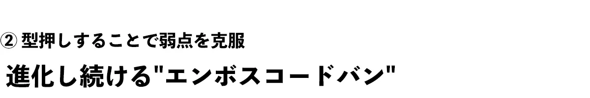 上記コードバンとベースは同じで、型押し加工を施したのが、エンボスコードバンとなります。型のベースは90年代に流行った型を型押ししています。型押しされることで、傷がつきにくく、濡れても水ぶくれせず、さっと拭き取るだけで平気です。カジュアルに使いたい方におすすめ。