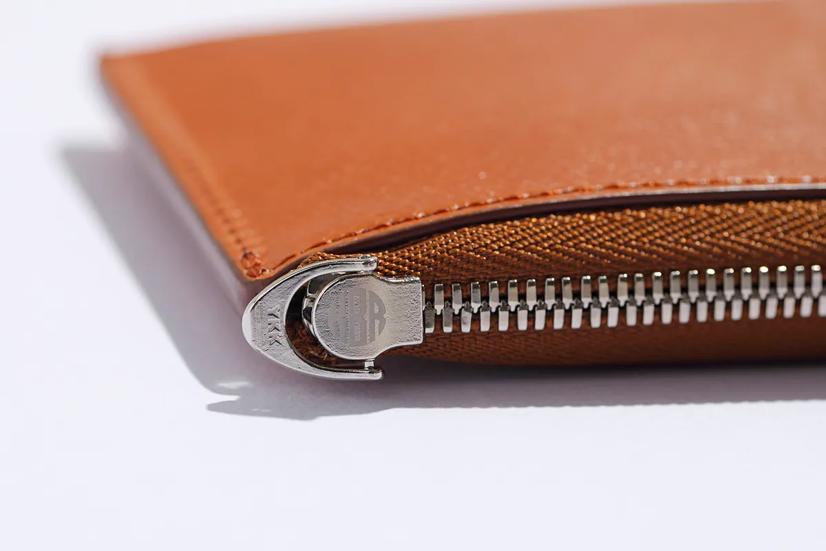 ブランドロゴが刻印されたYKKの最高級引手とファスナー