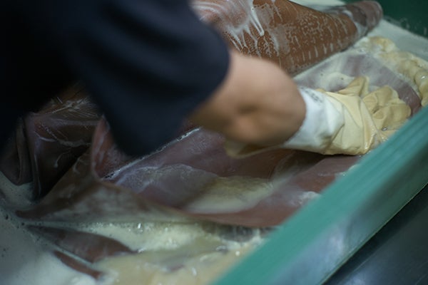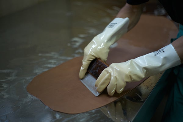 まずは、ミモザ100%のタンニンを用いてなめされた良質の革に、脂を入れ丹念にのばしていく。コードバンは脂のコントロールがすべて。この作業で品質の約8割が決まるという。