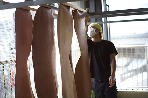 続いて、のばし終えた革を細長い木の棒に打ち付け、2本の長い竿(さお)に載せて乾燥させる。屋外で1日、室内で2日の計3日。均等に並べ、気温と湿度によって干す時間を調整する。
