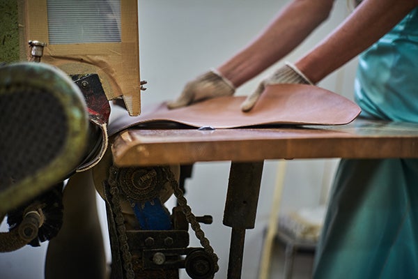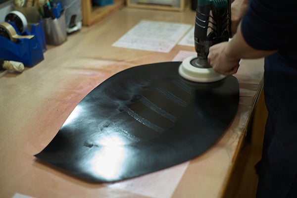乾燥後に削りを行う作業場に入ると、驚くほどの大きな音が。部屋の中央に鎮座する古びた研磨機に向かい、職人が革を削っていた。フットペダルを巧みに操作し回転するヤスリに革をしなやかに当て、中に埋まった美しいコードバン層を探り当てる。