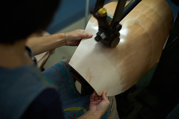この日は、3代目の小川雅子社長自らが作業に精を出していた。いすに座り、足のペダルを操作し、リズミカルに動くアームの先端に革を当てていく。過ぎた箇所はコラーゲン繊維が一方向に圧縮し、まるで鏡面のような艶やかさ。これを何度も繰り返す。