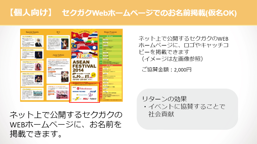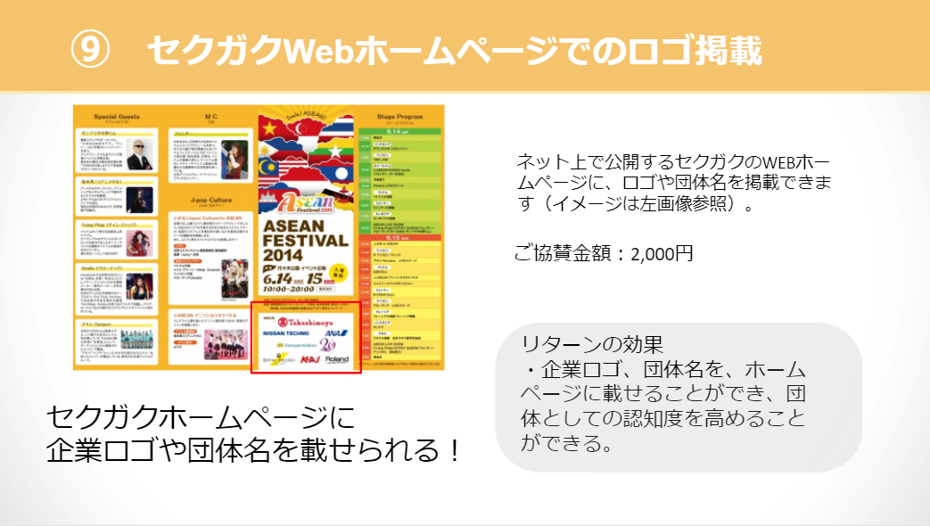 ●セクガクWEBホームページでの団体名・ロゴ掲載(¥2,000)ネット上で公開するセクガクのWEBホームページに、ロゴや団体名を掲載できます