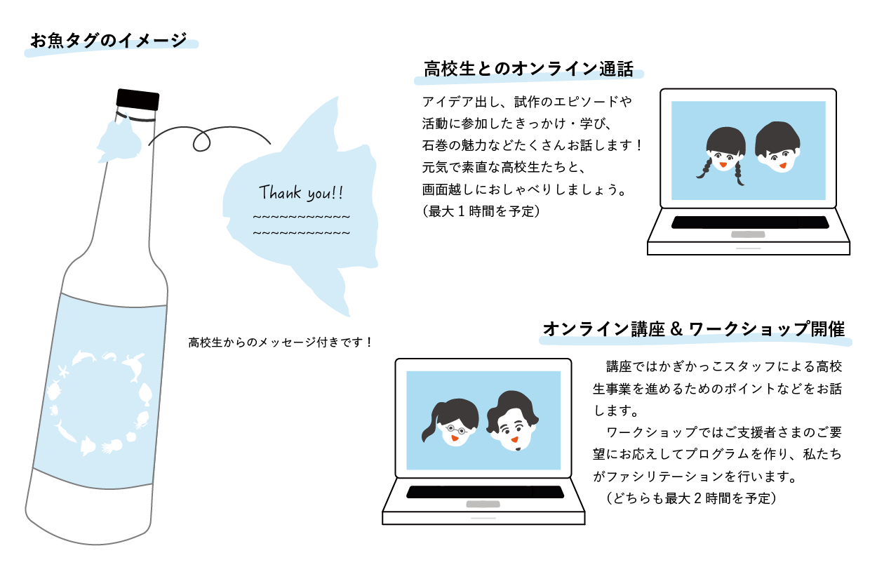サイダーつくりに関わった高校生メンバーがオンラインで商品づくりの背景や商品のアピールポイント・地元石巻の魅力を1時間ほどお話します!ご支援者さまからの質問もたくさん受け付けて、楽しくコミュニケーションを取れたらいいなと思います。(ご支援者さまお一人対高校生2〜3名とスタッフで行います)