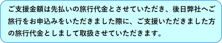 ご支援金額は、先払い金額としまして、後日弊社にて旅行されます場合に、旅行代金としてご利用いただけます。