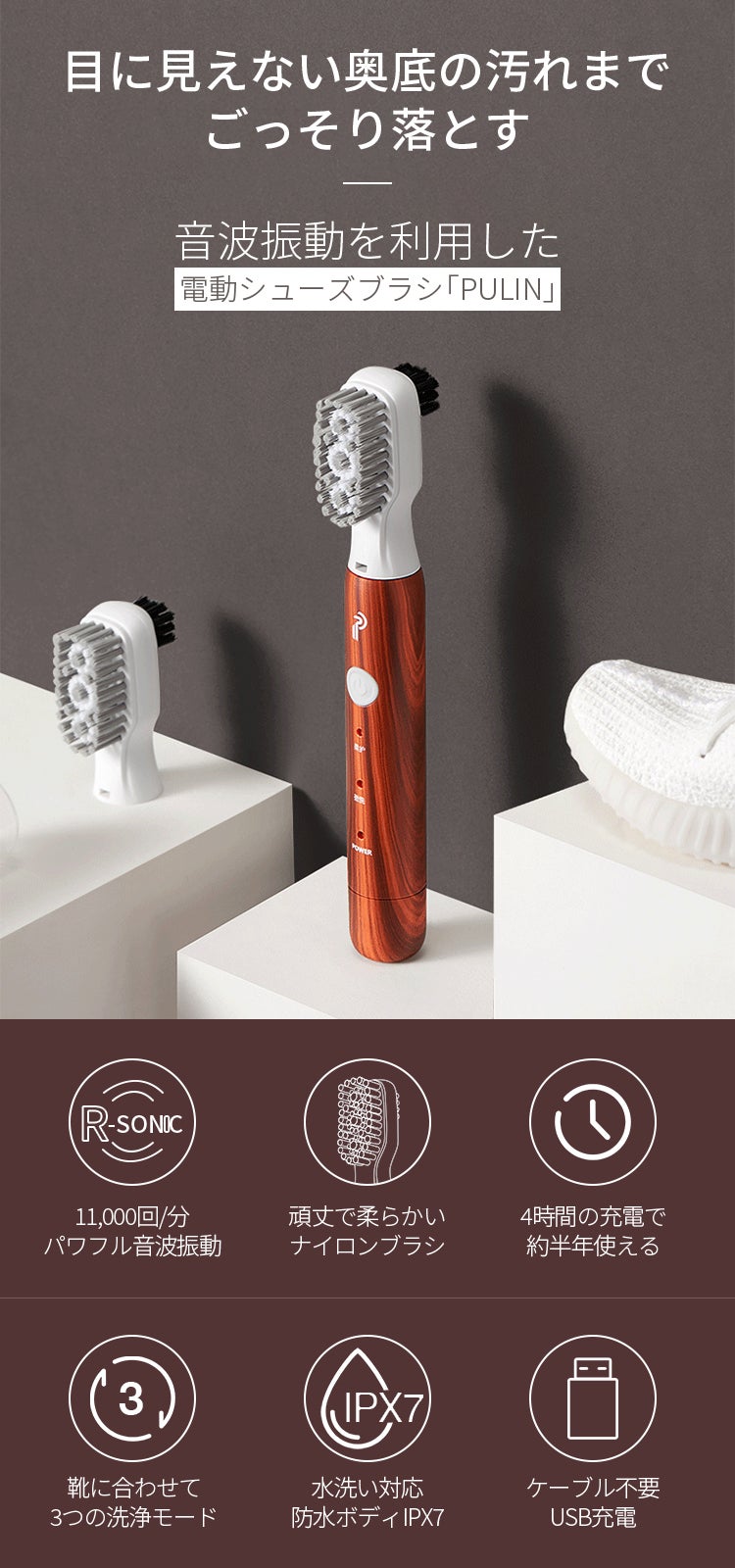 「PULIN」は1分間で最大11,000回振動するパワフル音波を利用して、奥まで入り込んだ汚れも徹底オフ。手洗いのゴシゴシでは落とせない汚れもお任せください。さらに3つの洗浄モードと優秀なナイロンブラシで、スニーカーから革靴まであらゆる靴に対応。1回の充電で半年間使用できる抜群の実用性を持ちながら、持ち手部分の木目でおしゃれもとことん演出。