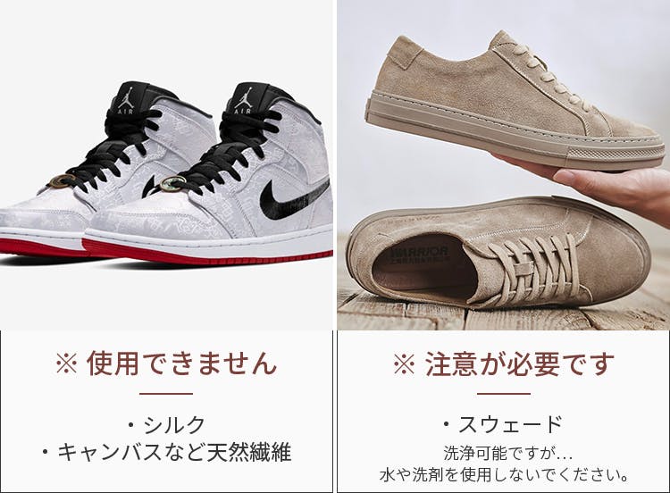 A.シルクや天然繊維の靴、メーカーが洗浄を禁じている靴には使用しないでください。また、スウェード素材の靴に使用する場合は、洗剤・水は使用しないでください。