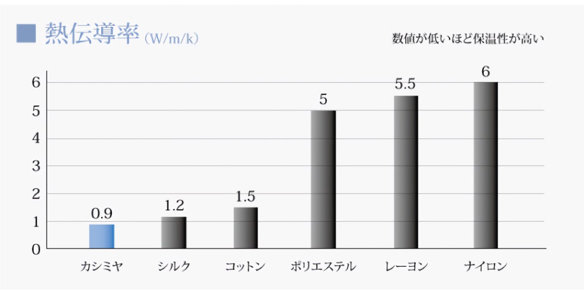 カシミヤ繊維は他の繊維より非常に細いという特徴をもっています。同じ太さの糸であっても、繊維が細ければ細いほど多くの繊維で束ねられた糸に仕上がります。クリンプ状で細いカシミヤ繊維は複雑によく絡み合うので、カシミヤの糸は、熱伝導率の低い空気をたくさん抱き込むことになります。カシミヤは繊維自体の熱伝導率も優れていますので、その糸を用いてつくられる生地は、外気を遮断し、放熱を抑えるという、二重サッシ窓の様な役割を果たしてくれます。熱伝導率が低い空気を、たくさん取り込むことのできるカシミヤ製品は、軽くて保温/保湿にも優れています。