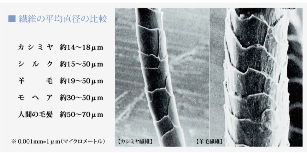 カシミヤ繊維の平均直径は14μm(μmは1/1000ミリ)前後と、羊毛や他の動物繊維に比べて細いため、チクチクと皮膚を刺激しません。一番細い高級羊毛のジロンラムでも16μm、エクストラファインウールは19.5μm、メリノウールは23μm、アルパカは24〜31.5μm、モヘヤはもう少し太くて30〜50μmですので、その細さは毛素材で一番細いといえます。そして、羊毛に比べると伸縮率が40%以上も高いため、生地や製品になったときに、しなやかでとても柔らかい肌触りがうまれます。