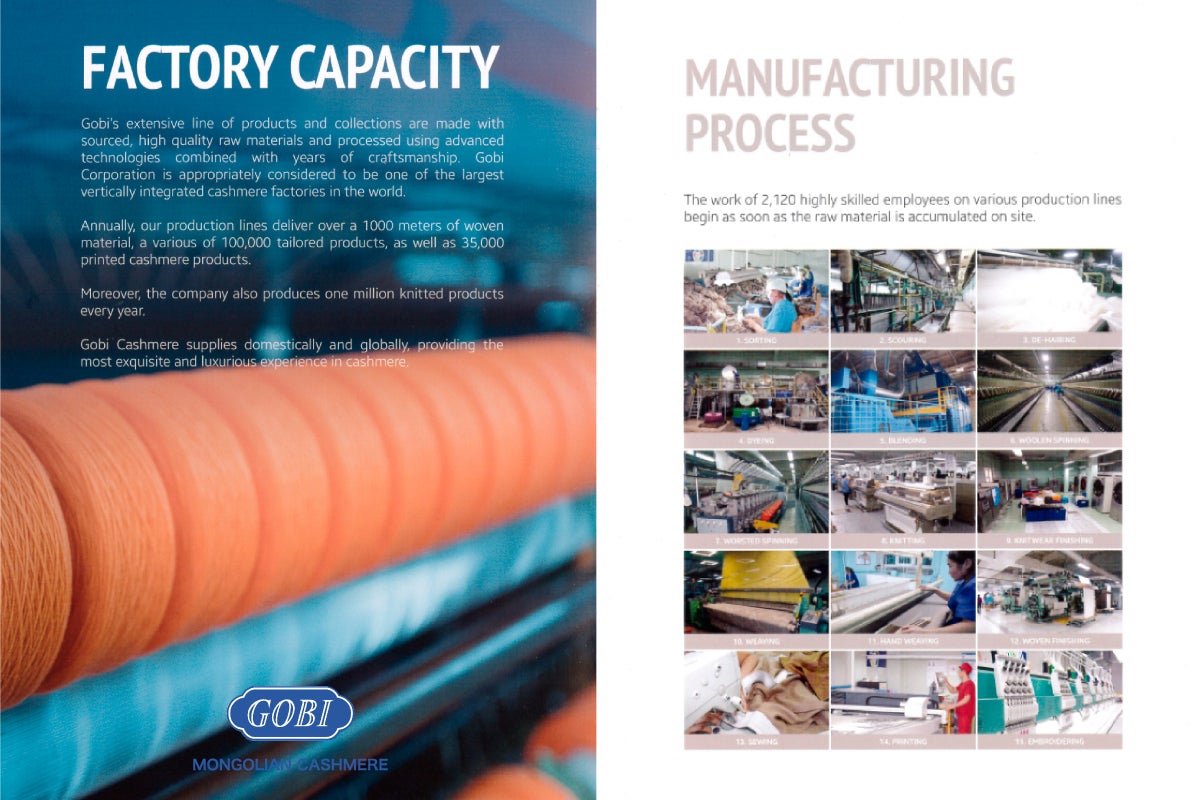 GOBIは、1981年にモンゴル政府と日本政府の共同事業として設立されました。カシミヤ山羊の原毛から製品化までの全行程を一貫して管理・生産している世界最大級のメーカーで、世界一の100%カシミヤコート製造メーカーとして高い評価を得ています。2007年に民営化されてからは、世界の有名アパレルのOEM生産を長年行ってきた経験をもとに、圧倒的なクオリティとコストパフォーマンスを実現したコレクションを13カ国40都市以上で展開しています。そのラグジュアリーなコレクションは、カシミヤブランド世界トップ5に認められています。