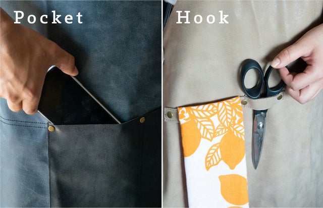 ポケットにはスマートフォンを入れたり、ガーデニングやDIYで使う工具を入れたり。フックにクロスをつけておけば、いつでも手の汚れを気にすることなく作業に集中できますよ!