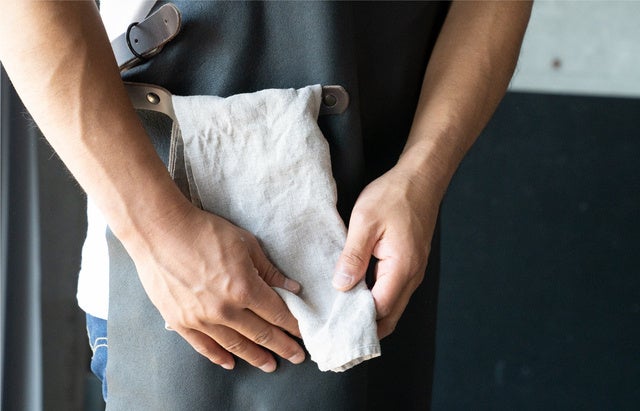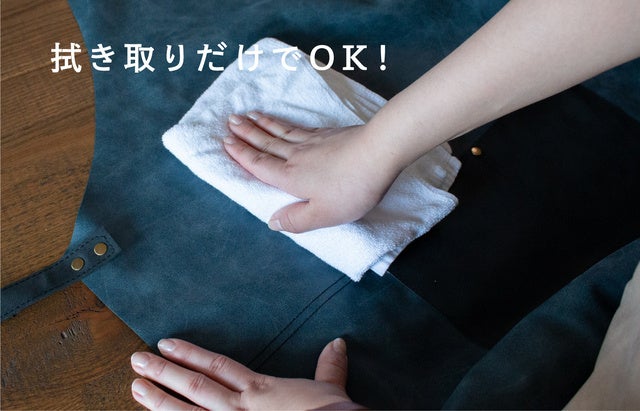 GUSTAエプロンには、特殊加工(イージークリーニング加工)が施されており、日常のご使用では汚れがついても水を含ませたふきんで拭き取るだけでOK!