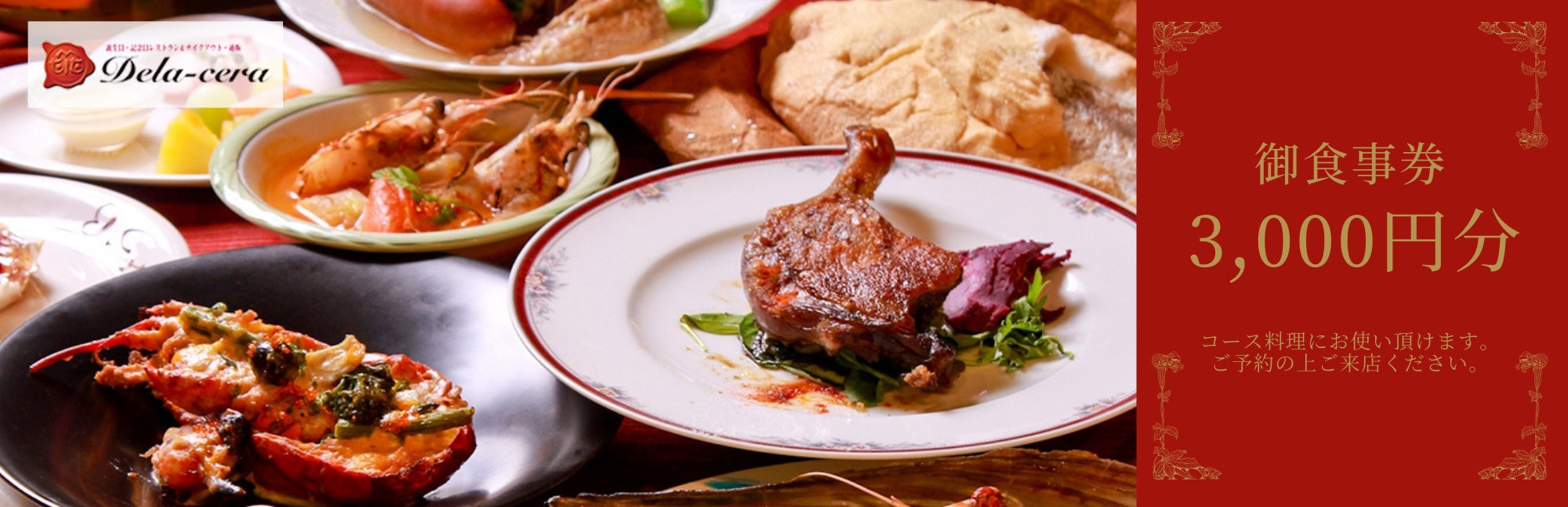 予約来店時にコース料理にお使い頂ける3,000円分の御食事券です。