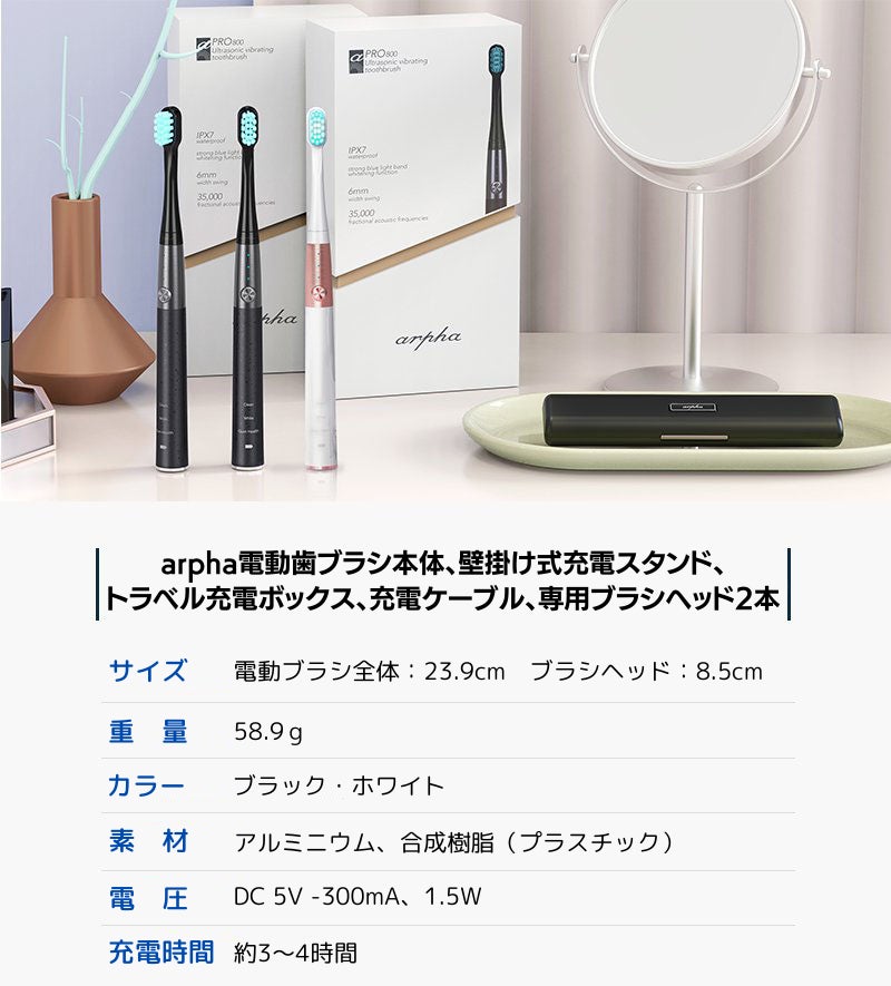 パッケージ内容:arpha電動歯ブラシ本体×1、壁掛け式充電スタンド×1 、トラベル充電ボックス×1 、専用ブラシヘッド×2、充電ケーブル×1